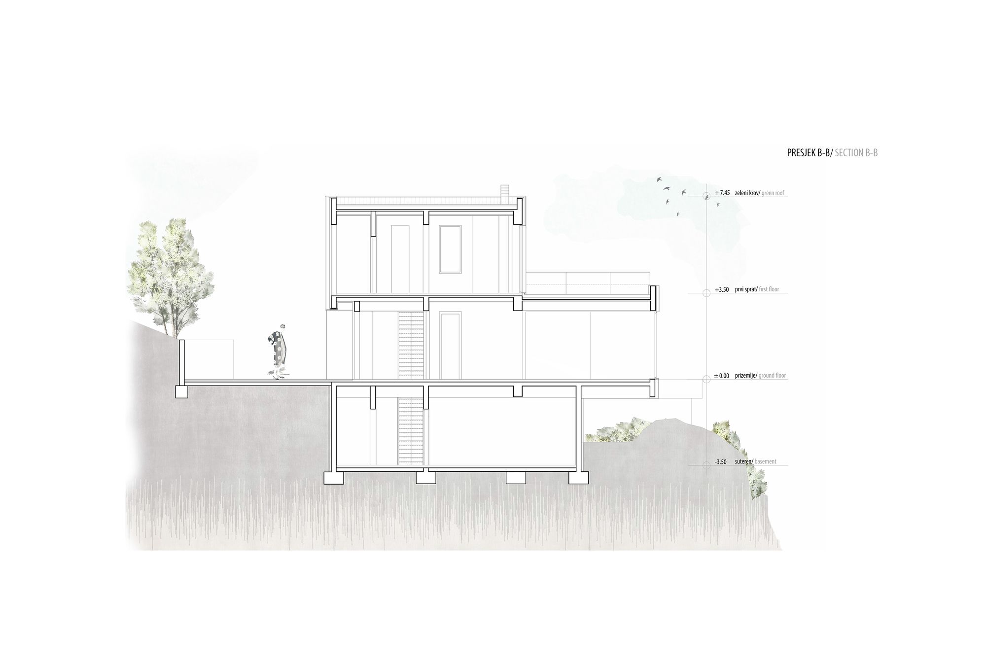Lokacija i morfologija terena su uslovili linearno razvijanje objekta i njegovu funkcionalnu organizaciju kroz dve nadzemne i jednu podzemnu etažu.