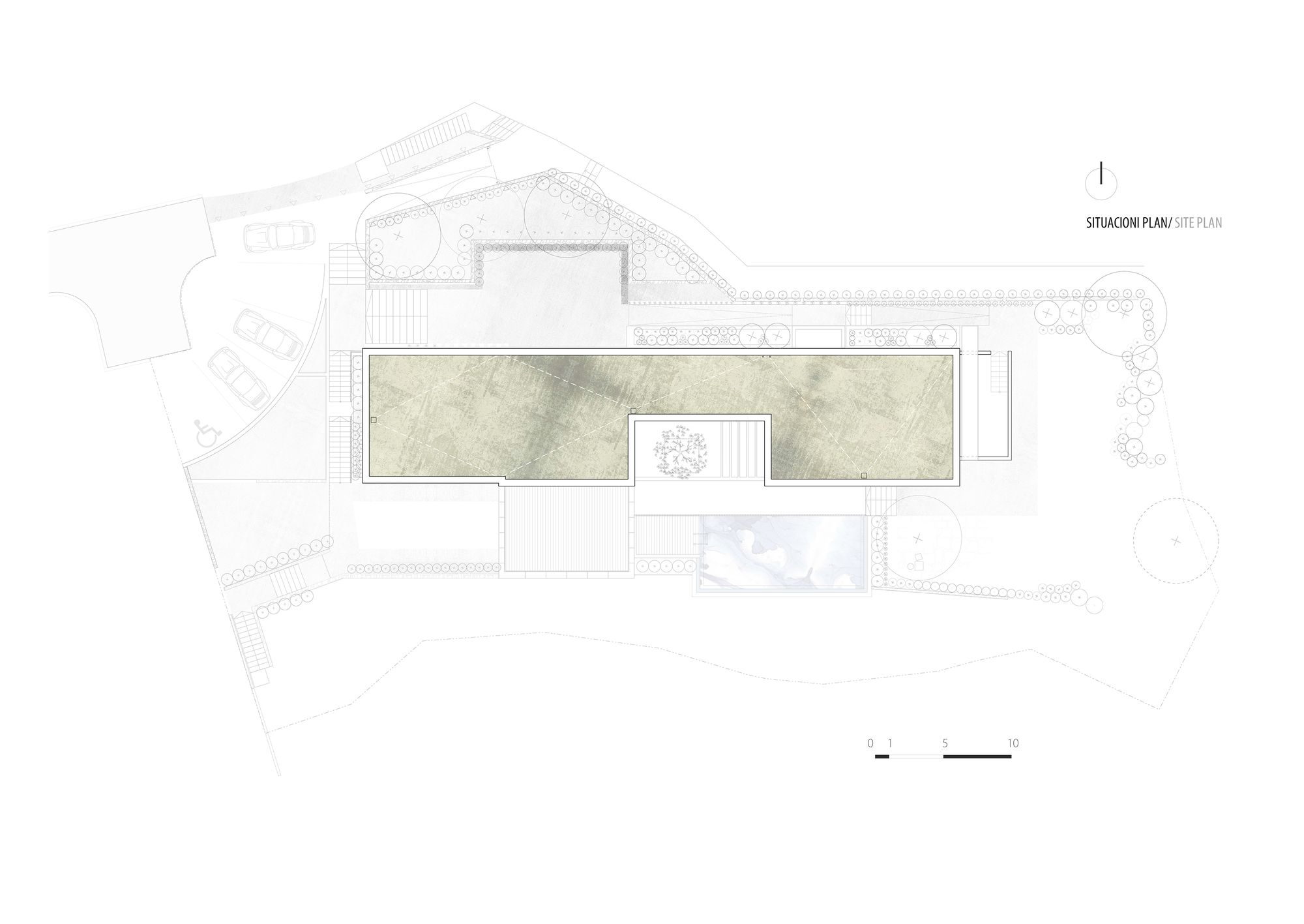 Pozicioniranje objekta na parceli podrazumevalo je izvesno udaljavanje objekta od postojeće saobraćajnice, formiranjem zelene bafer zone uz šetalište koje se provlači granicom placa, a koje povezuje Stari Grad i Sveti Stefan. Funkcionalna organizacija prizemlja, omogućava interakciju s neposrednim prirodnim okruženjem, koji korisniku pruža mogućnost boravka i uživanja u njemu.