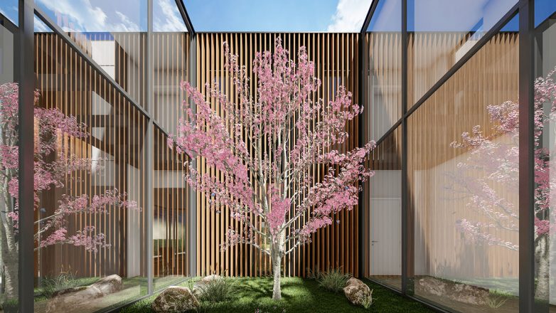 Specifičan zahtev klijenta bio je da se na imanju obavezno pojavi japanska trešnja upečatljive krošnje i boje cveta. Ovaj imperativ iskorišćen je kao centralni oblikovni i organizacioni motiv. Sa zastakljenim atrijumom, kuća je dobila specifični doživljaj pri kretanju, a sve to kroz dinamično pretapanje odnosa spolja/unutra i otvoreno/zatvoreno. Kako je japanska trešnja osetljiva vrsta drveta, arhitekte su imale izazovan zadatak da inženjerski reše zalivanje i mikro klimu neophodnu za rast ove egzotične biljke.