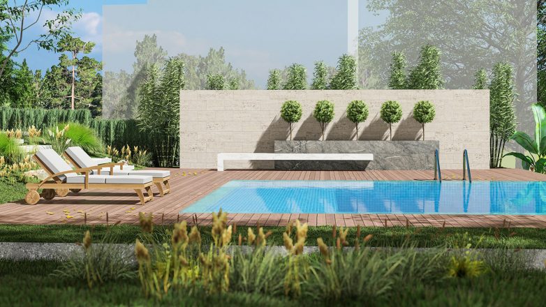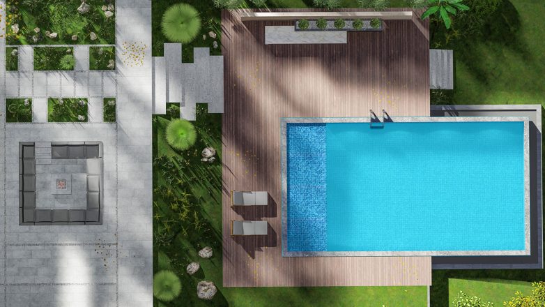 Posebni akcenat stavljen je i na parterno uređenje. Projektom se predviđa razigrano uređenje u ortogonalnom rasteru, kao i izgradnja „infinity bazena“ reprezentativnih razmera. Plato oko bazena popločan je u deking sistemu, a predviđa se primena mermera i travertina za vertikalne površine. Pristupne staze oko objekta rešene su u oblozi kvadratnog formata s naglašenim dilatacionim spojnicama.