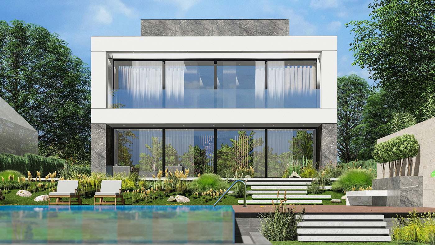 „Očekivanje klijenta nas je usmerilo ka svedenoj formi“ – naglašava Buđevac. Izražena dužina kuće (preko 25 metara) raščlanjena je drvenim vertikalama i odvajanjem fasade u dve završne obrade po vertikali. Donja masa čvrstog bazisa definisana MARAZZI keramičkom oblogom velikog formata koja nosi beli, lagani volumen. Spratni deo objekta rešen je u sistemu kontakt fasade s kamenom vunom kao termoizolacionim materijalom. Finalna obrada fasade je od dekorativnog maltera visoke paropropusne moći.