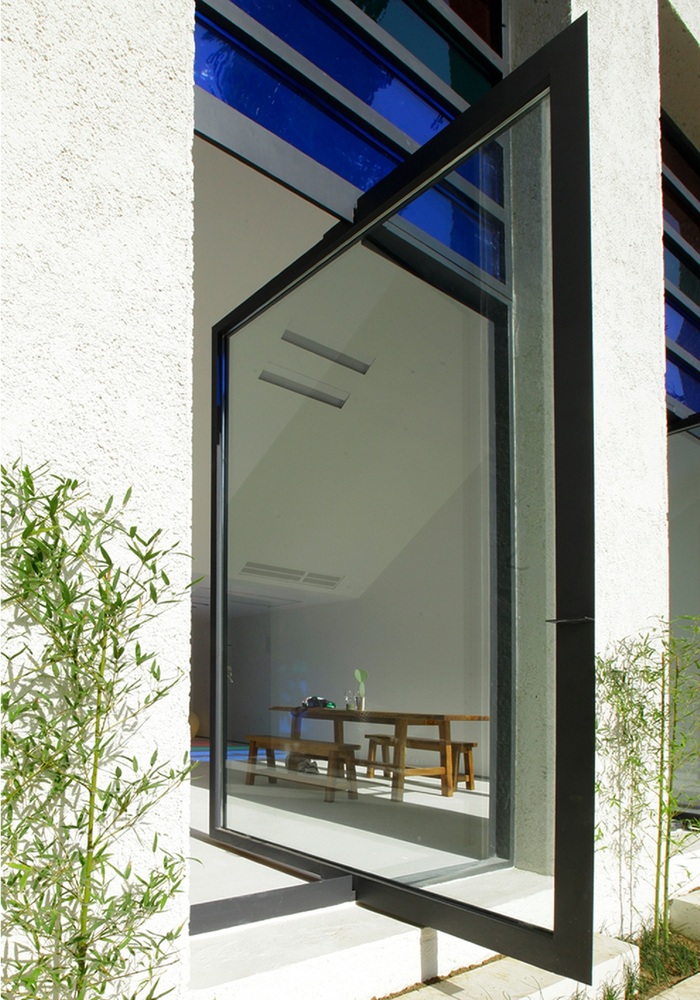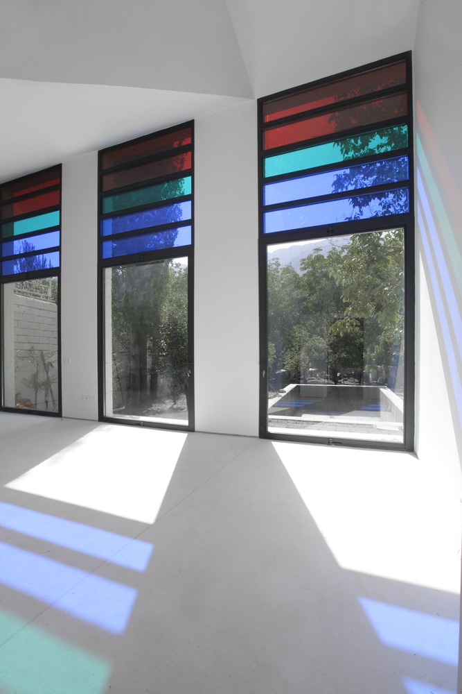 Ovo poslednje postignuto je tako što su na prozore dodati stakleni paneli u tri boje koji prave toplu atmosferu kada kroz njih prođu sunčevi zraci. Pošto je prostor lišen detalja i pošto je on potpuno beo i minimalistički, ova pokretna koloritna šema spiritualno obogaćuje prostor, piše ArchDaily.