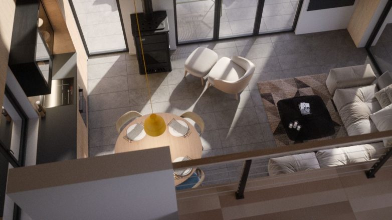 Centralni deo kuće je dnevna zona otvorenog plana, koja ima duplu spratnu visinu. To je jedinstvena celina koju čine prostrani dnevni boravak, trpezarija i kuhinja, odakle se izlazi na terasu.