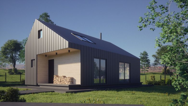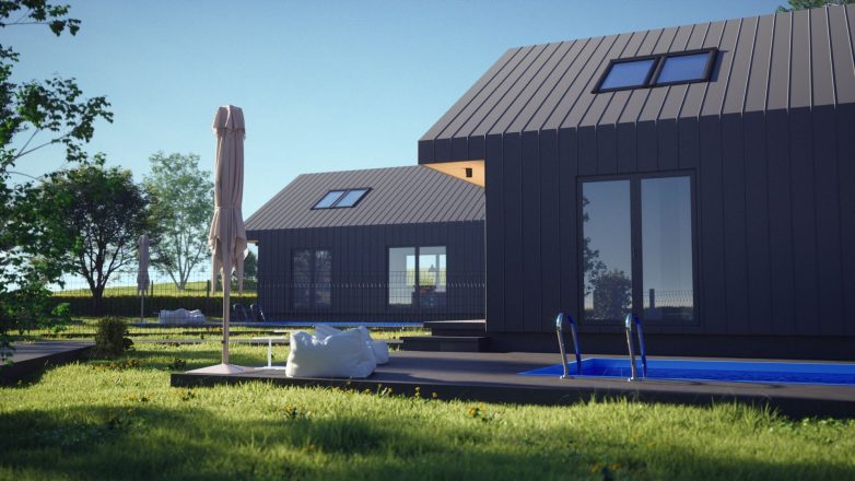 Kuće su „odevene“ u tamnosivi panelni lim, a „nedostajući“ delovi tamnog kubusa obloženi su masivnim drvetom, naznačavajući toplinu i prijatnost u enterijeru.