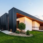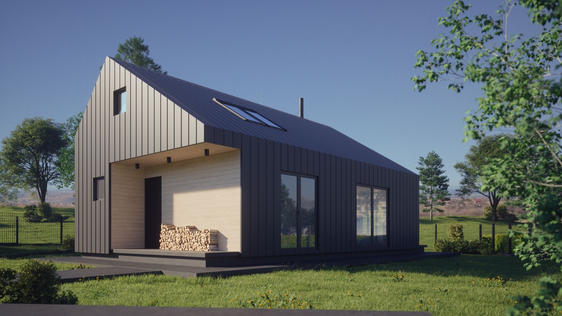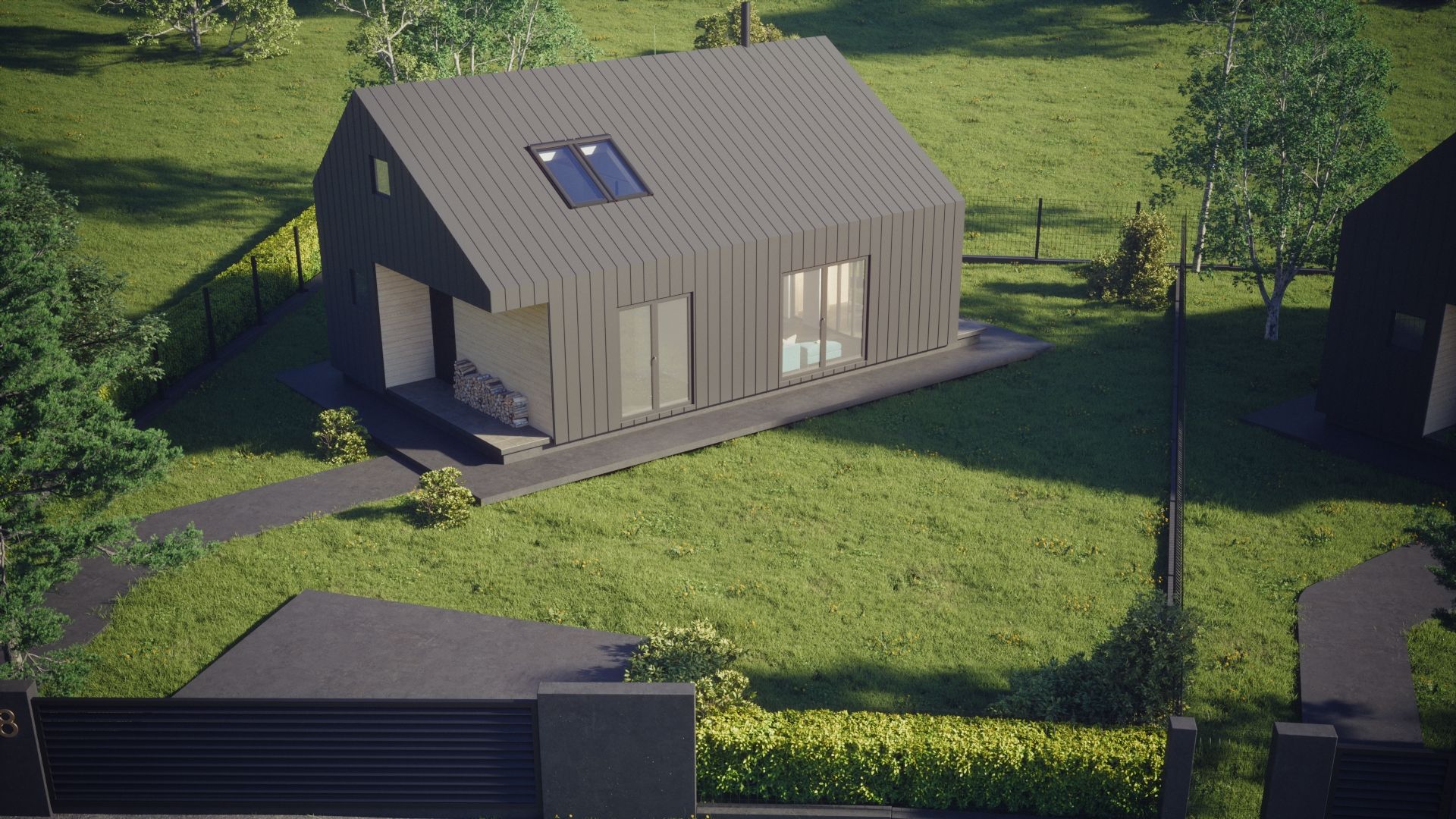 Posmatrana spolja, kuća je zamišljena kao jedna kompaktna celina koja simboliše stabilnost – „obučena“ u tamnosivi panelni lim, a „nedostajući“ delovi tamnog kubusa obloženi su masivnim drvetom, što je već naznaka topline i prijatnosti unutrašnjosti kuće, dok ulazni trem ima tradicionalnu funkciju – kao zaštita od kiše.