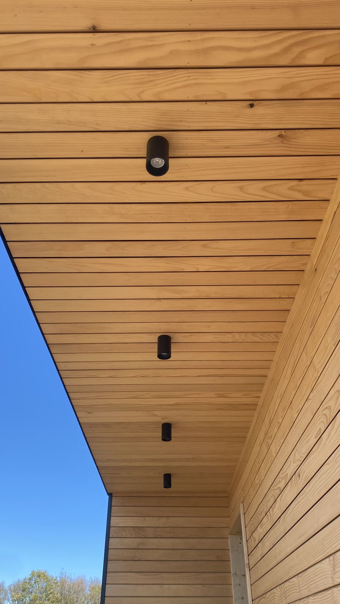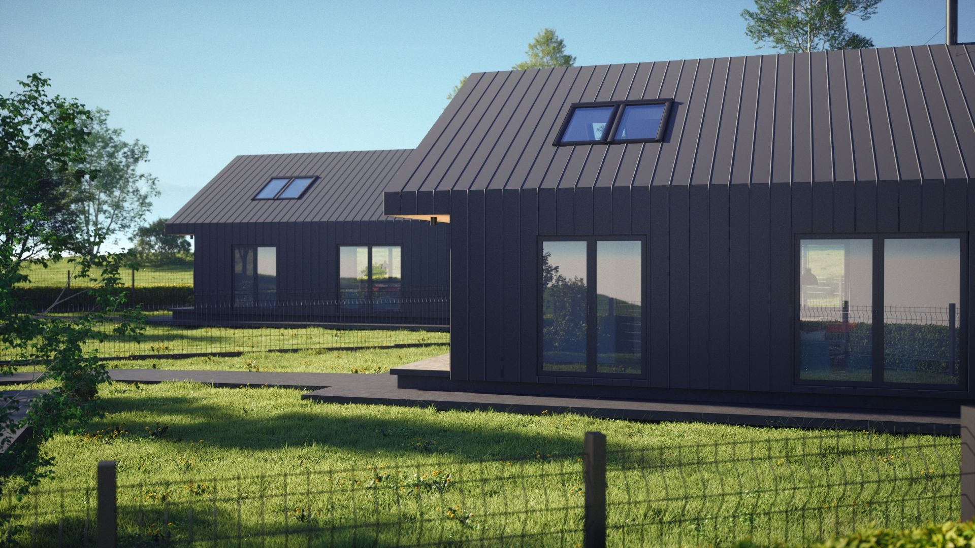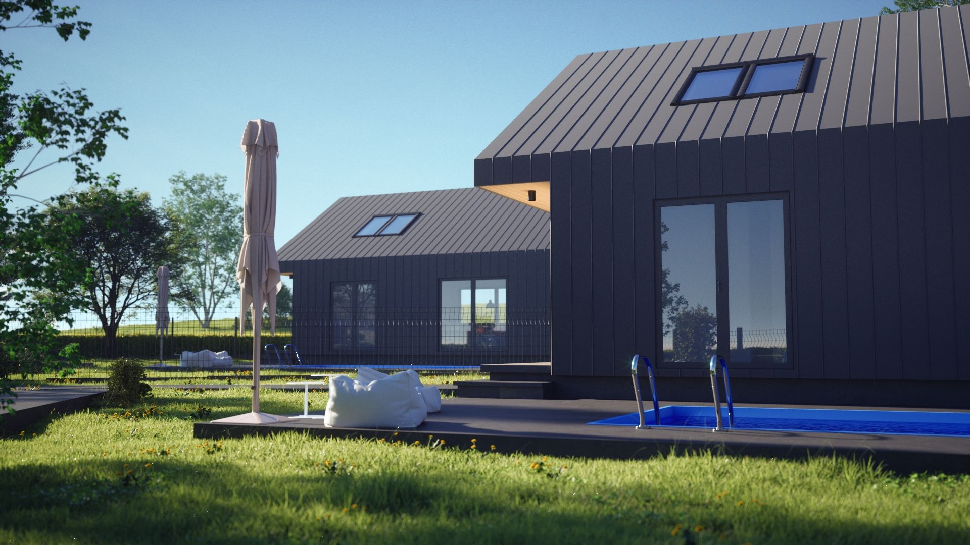 Kuće su „odevene“ u tamnosivi panelni lim, a „nedostajući“ delovi tamnog kubusa obloženi su masivnim drvetom, naznačavajući toplinu i prijatnost u enterijeru.