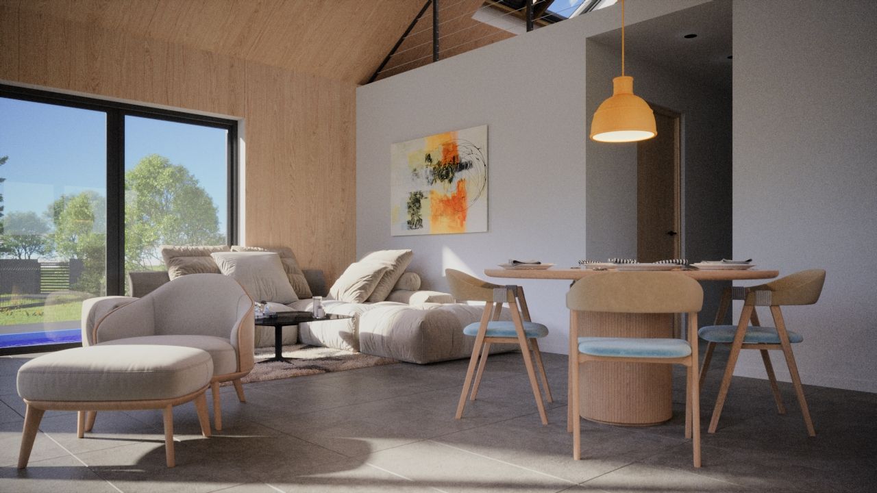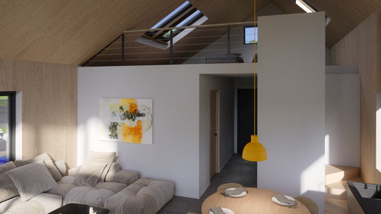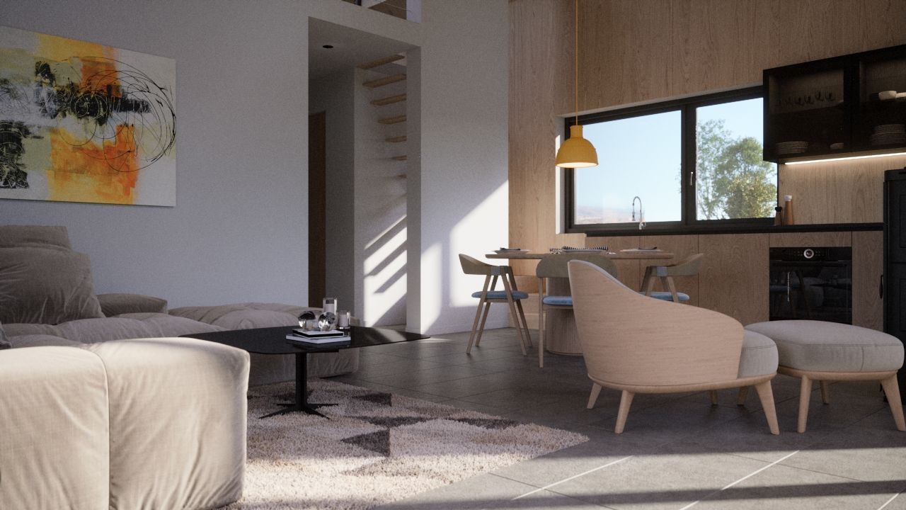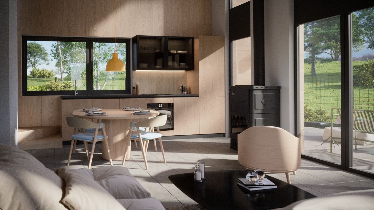 Centralni deo kuće je dnevna zona otvorenog plana, koja ima duplu spratnu visinu. To je jedinstvena celina koju čine prostrani dnevni boravak, trpezarija i kuhinja, odakle se izlazi na terasu.