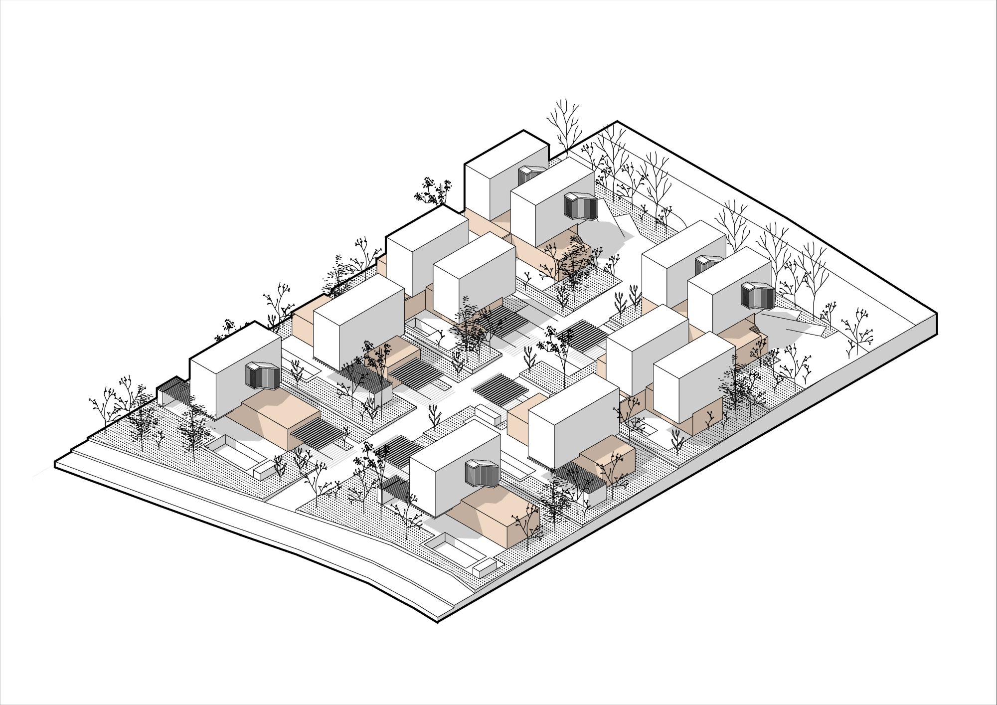 Unutar zgrada ujednačenih, strogih formi, koje, kako navode autori, „donose ponešto kartezijanskog reda i mirnoće u već izgrađenom okruženju“, smeštaju se kuće za odmor, dvojni objekti ili zgrade s četiri odvojena apartmana.