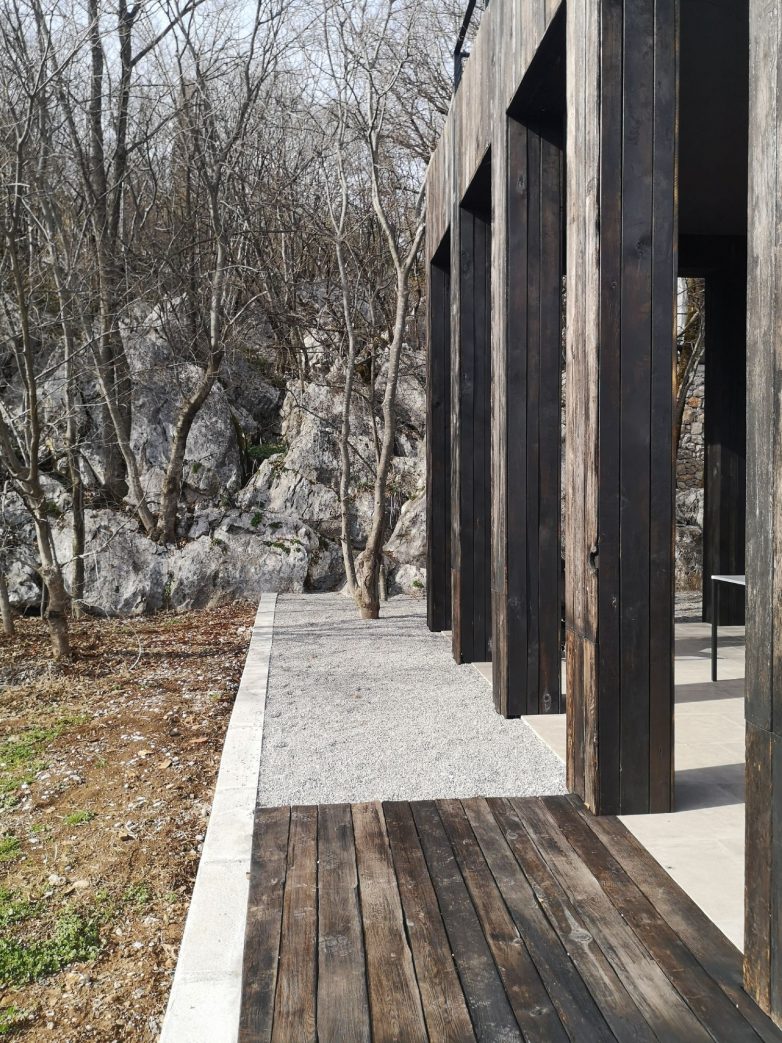 Donji blok vile je obložen drvenim daskama u tehnici paljenog drveta. Na ovaj način drvo se prirodnim procesom čuva, odnosno štiti od parazita i spoljašnjih uticaja.