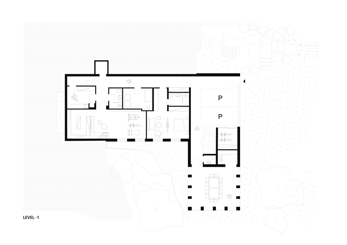 Najniži nivo objekta je rezervisan za smeštaj gostiju, kao i prostorije za vežbanje, razonodu i pomoćne prostorije, a na ovom nivou je i garaža. Iza objekta je smešten i bazen, uvučen u stenovito šumsko okruženje, navode na kraju podgorički arhitekti.