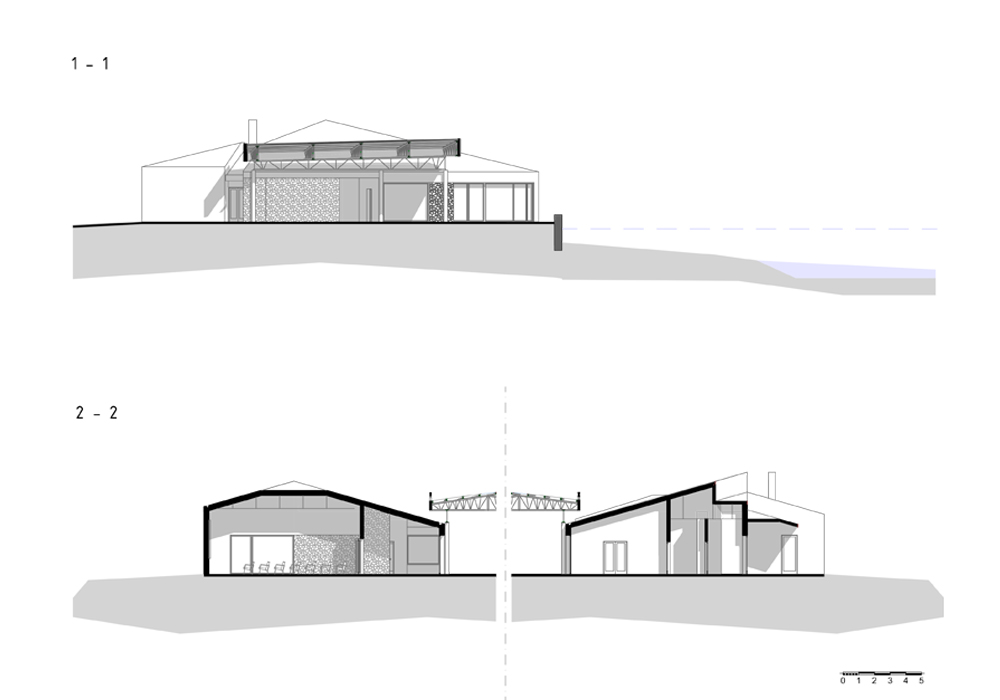 Objekat se „cepa“ na dva dela, grupišući funkcije tako da holski prostor postaje produžena terasa koja izlazi na reku.