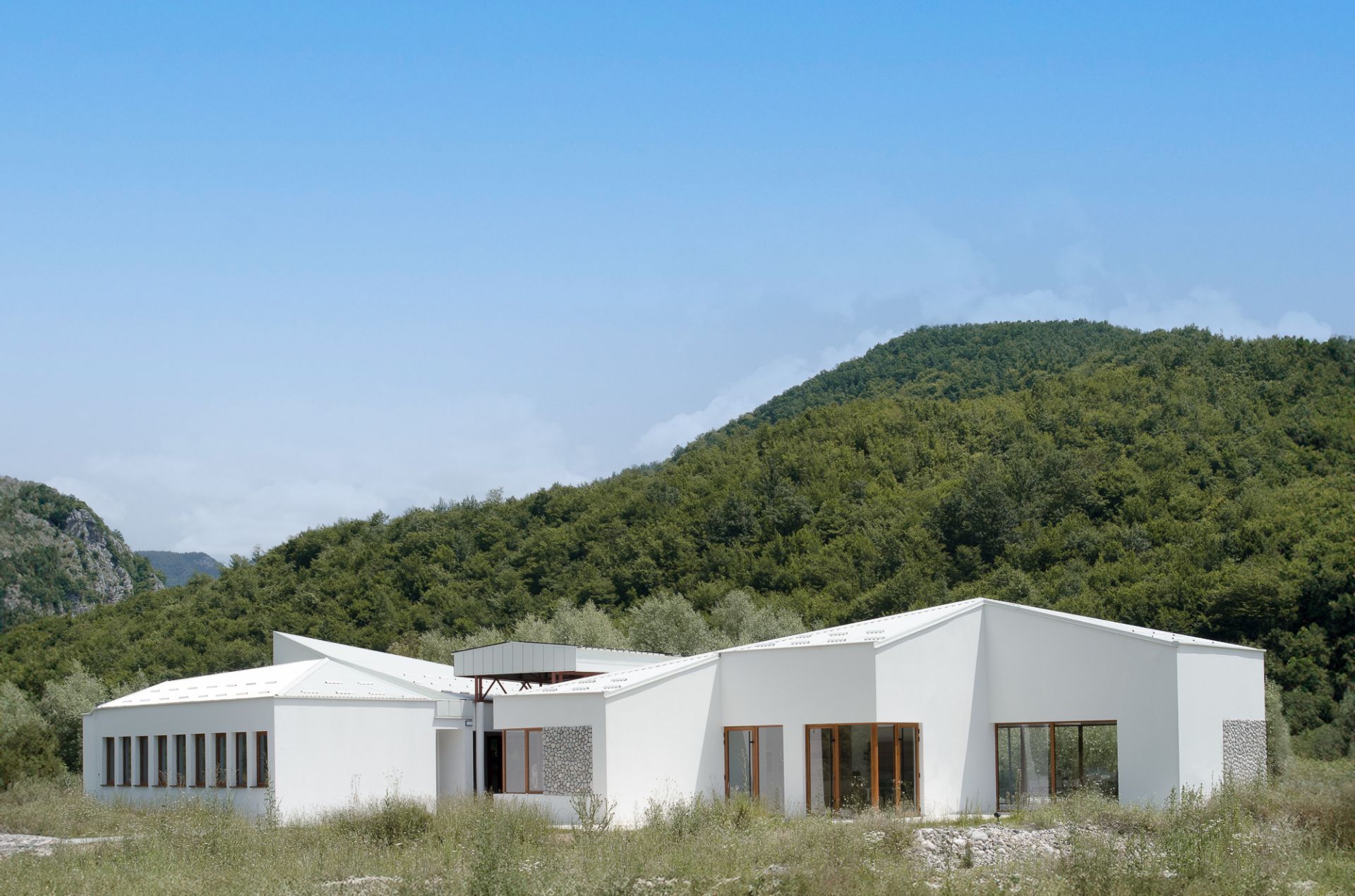 Površine su obložene lokalnim kamenom iz reke Bistrice na čijoj obali je podignut ovaj objekat od čelične konstrukcije i sa solarnim panelima na krovu.