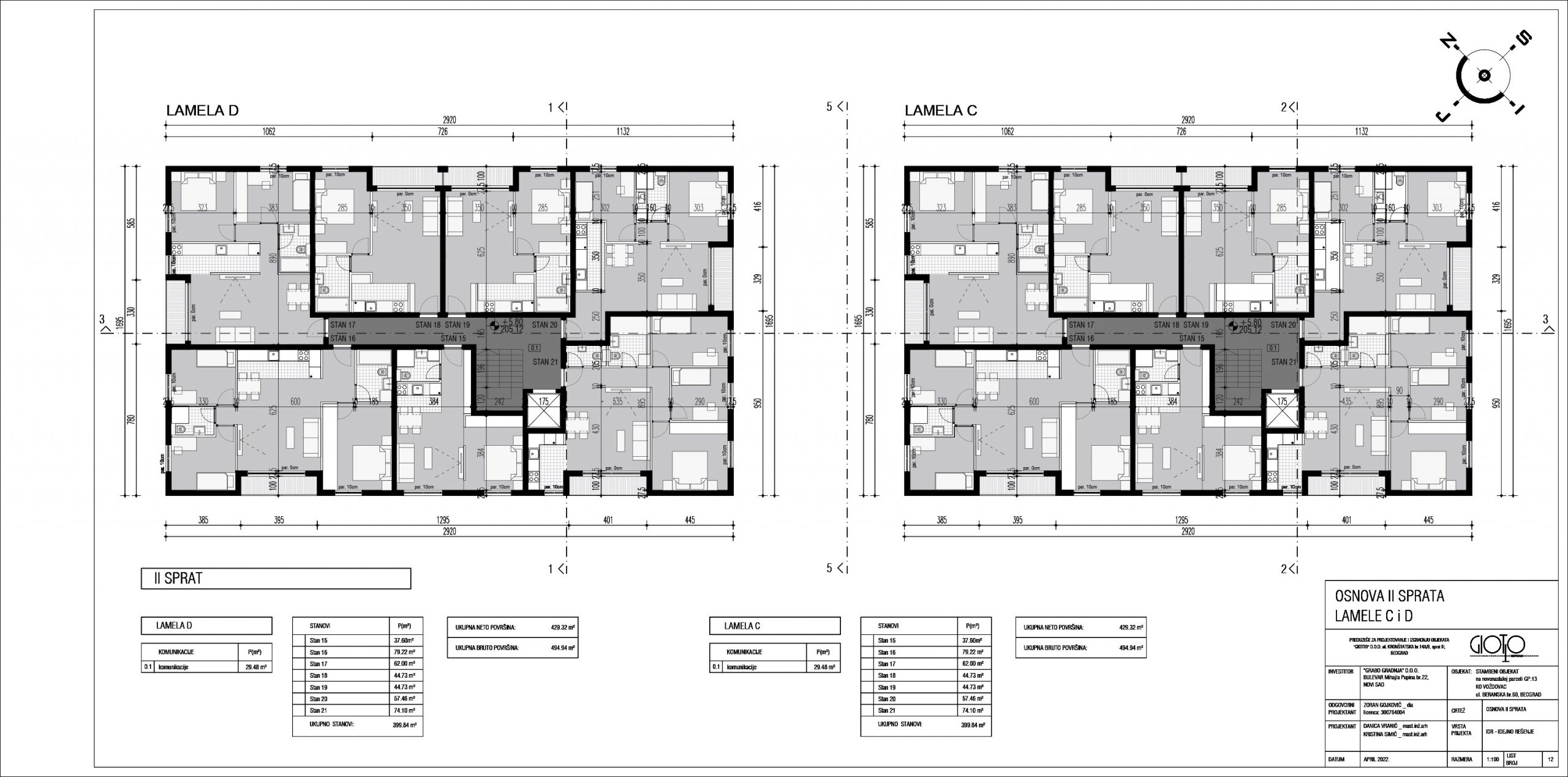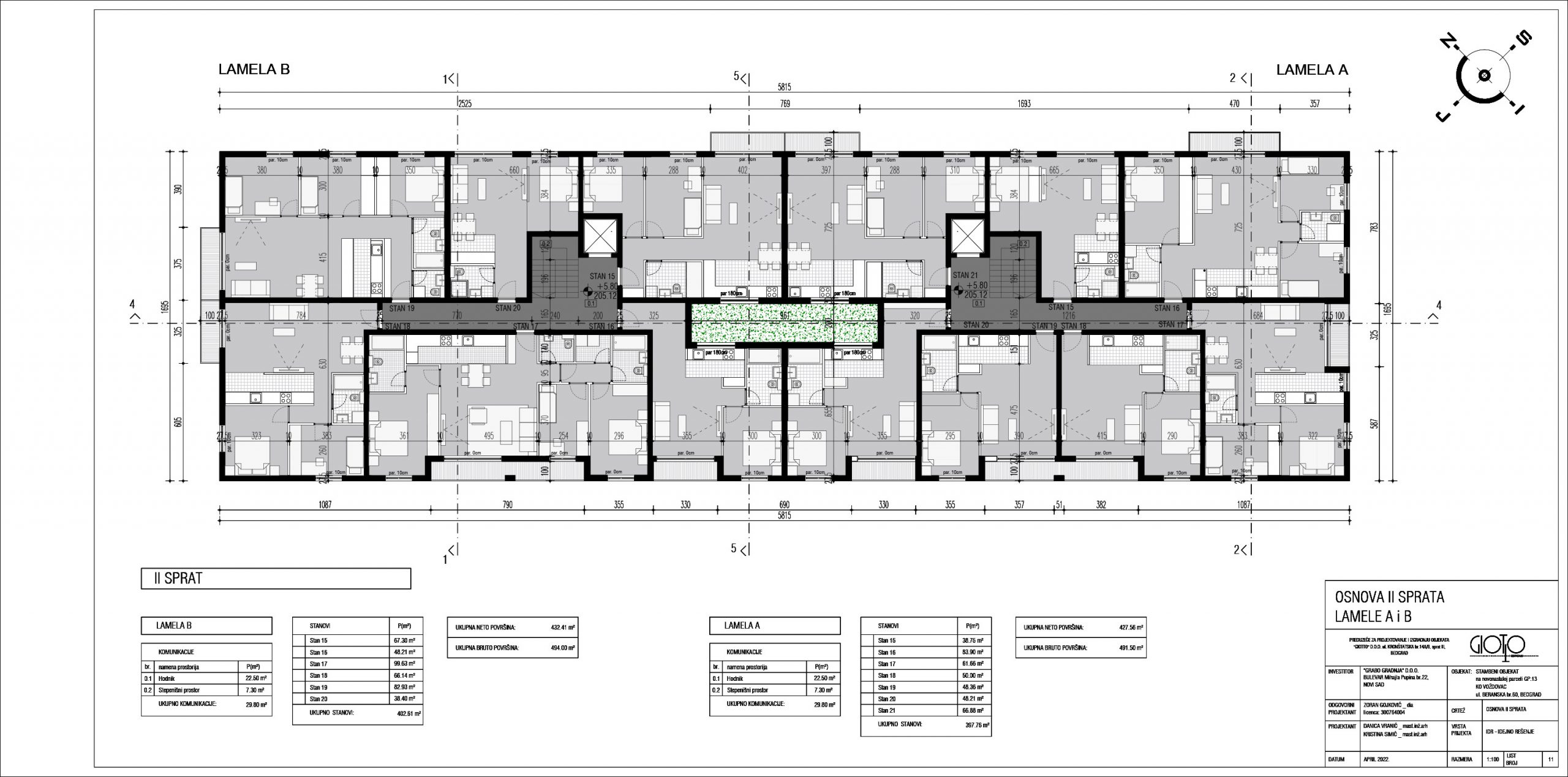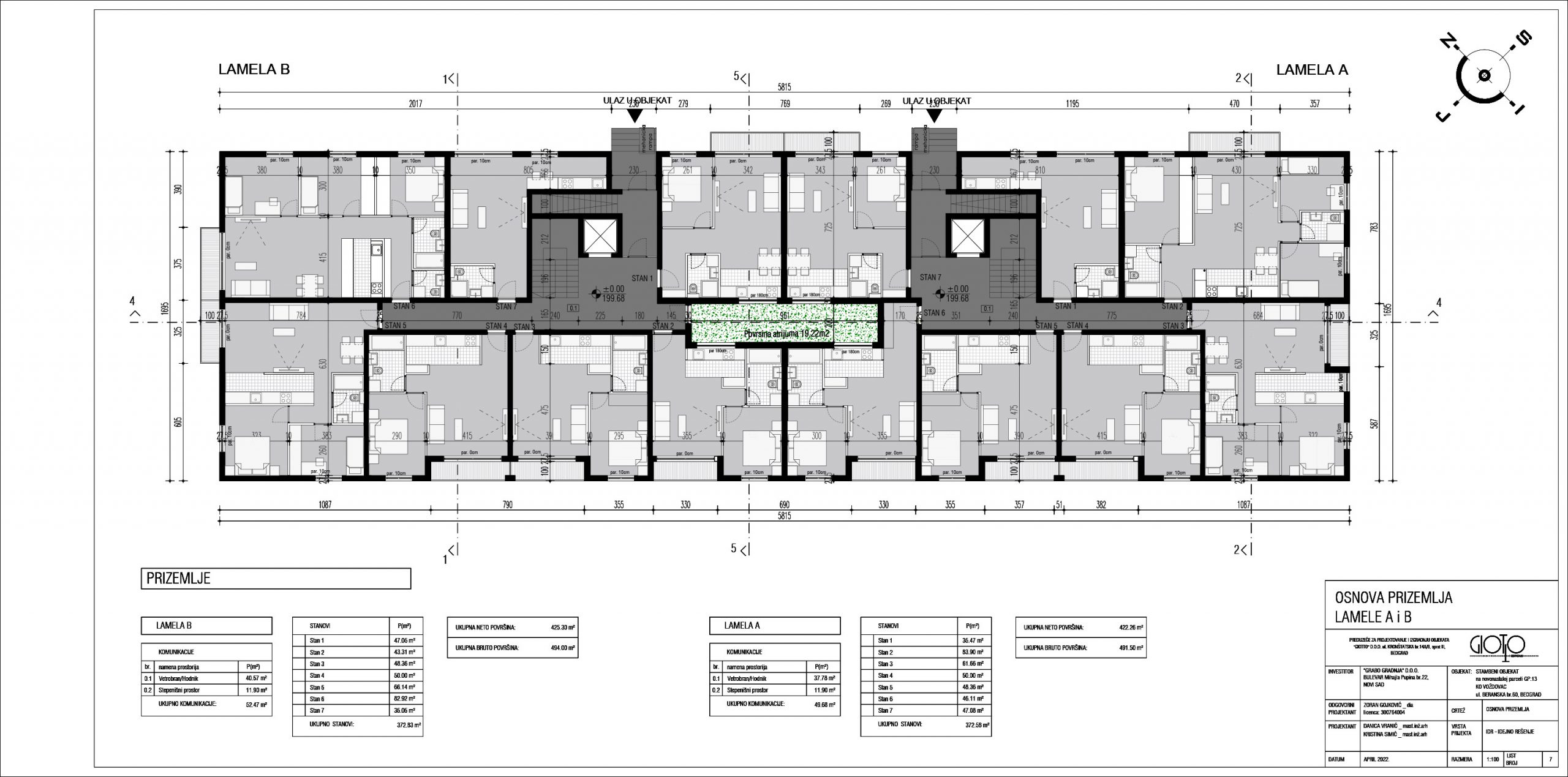 Ukupna bruto površina podzemnih i nadzemnih etaža lamela A, B, C i D iznosi 9.886,02 kvadratna metra.