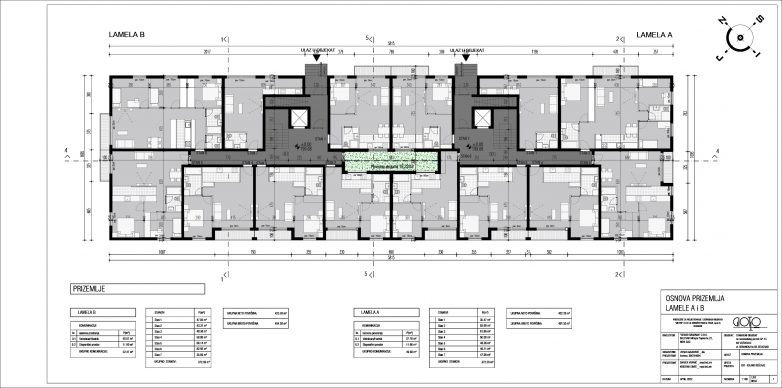Objekat sa ulazima A i B je konstruktivno jedinstven, a funkcionalno podeljen na dva ulaza – ulaz A sa 28 stanova i ulaz B sa 26 stanova. U podrumu je formirana garaža srednje veličine sa ukupno 38 parking mesta.