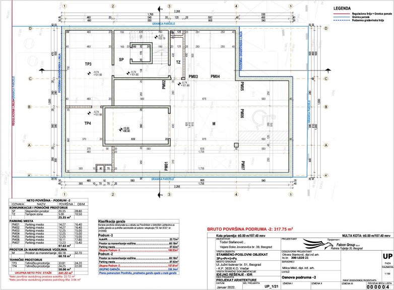 Predviđene su dve podzemne etaže koje sadrže prostor garaže sa po sedam parking mesta na svakom nivou (ukupno 14), kao i tehničke i zajedničke prostorije korisnika objekta.