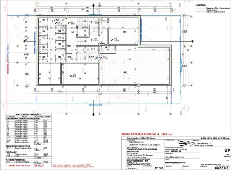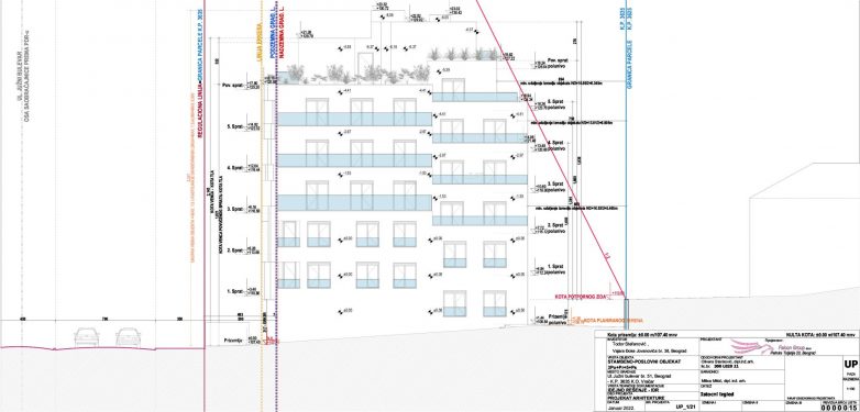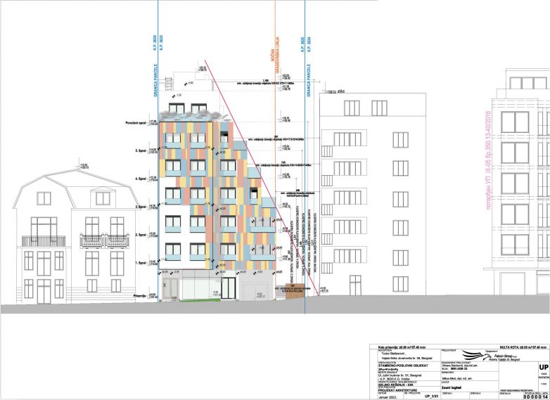 Novoprojektovana zgrada je po nameni stambeno-poslovni objekat ukupne BGRP od 2.128,82 kvadratnih metara – nadzemno 1.246,71m2 i podzemno 882,11 m2 .