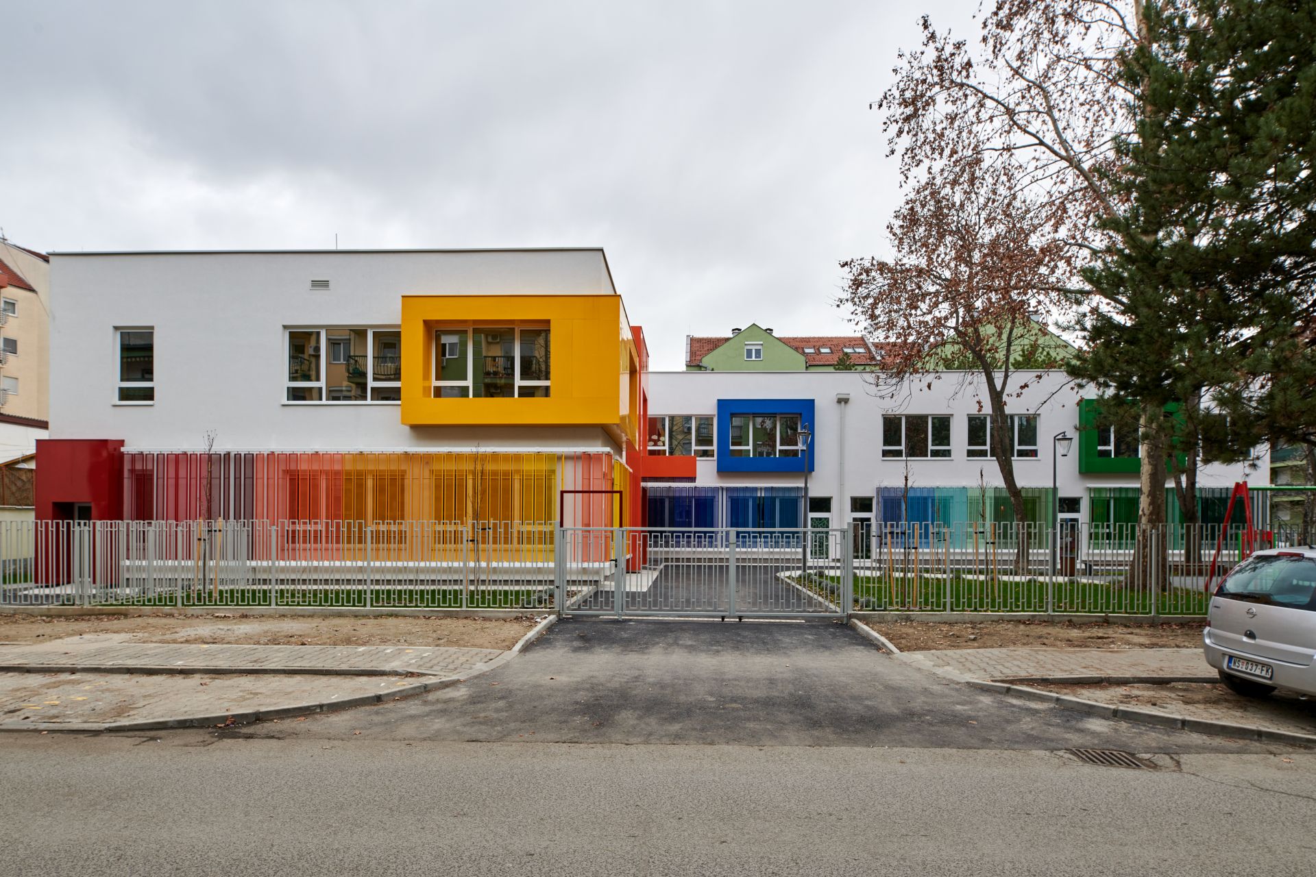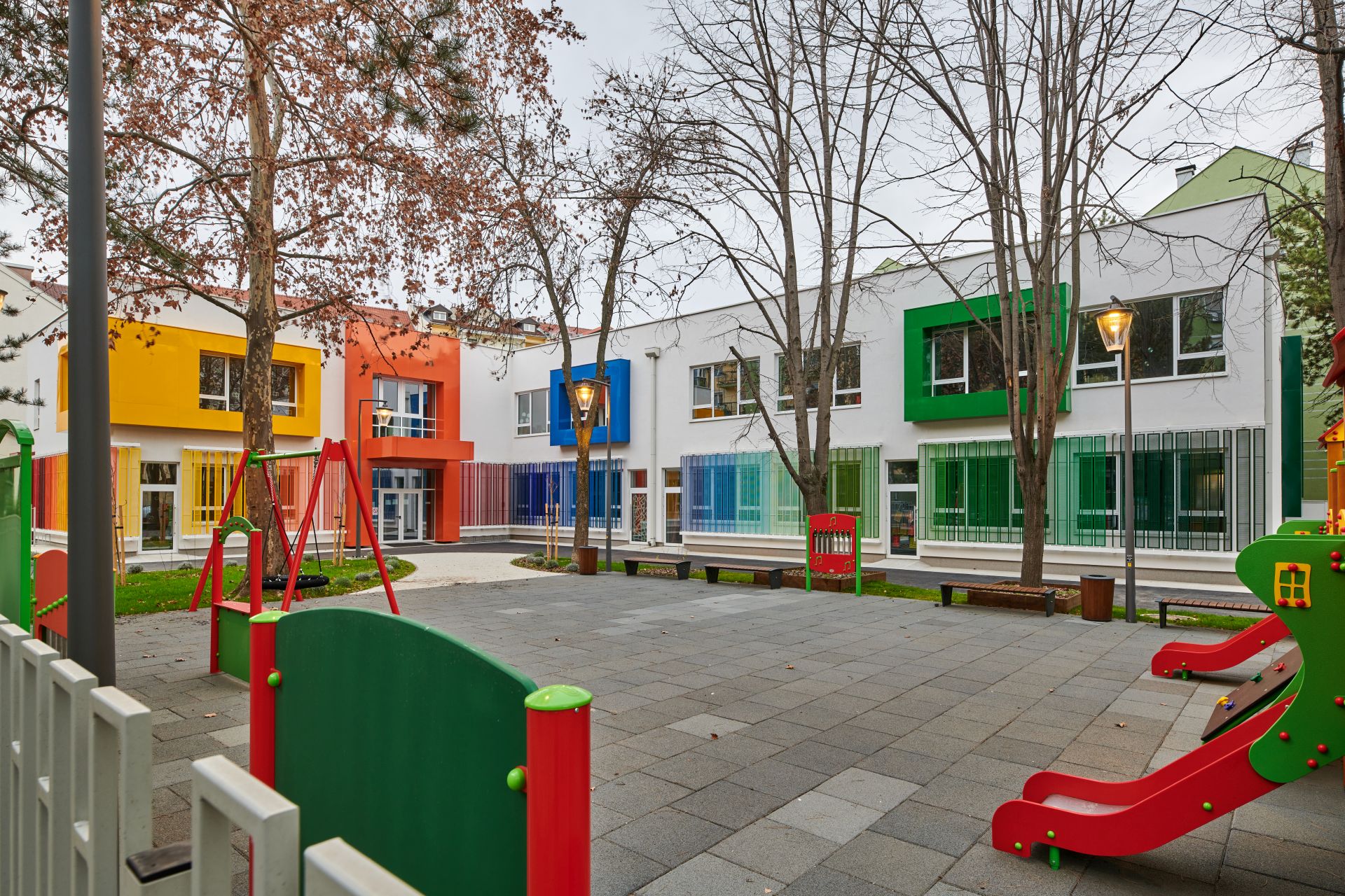 Ušuškani iza raznobojne fasade, mališani imaju na raspolaganju osam dnevnih soba za boravak, salu za igru, kao i dvorište s gumenom podlogom.