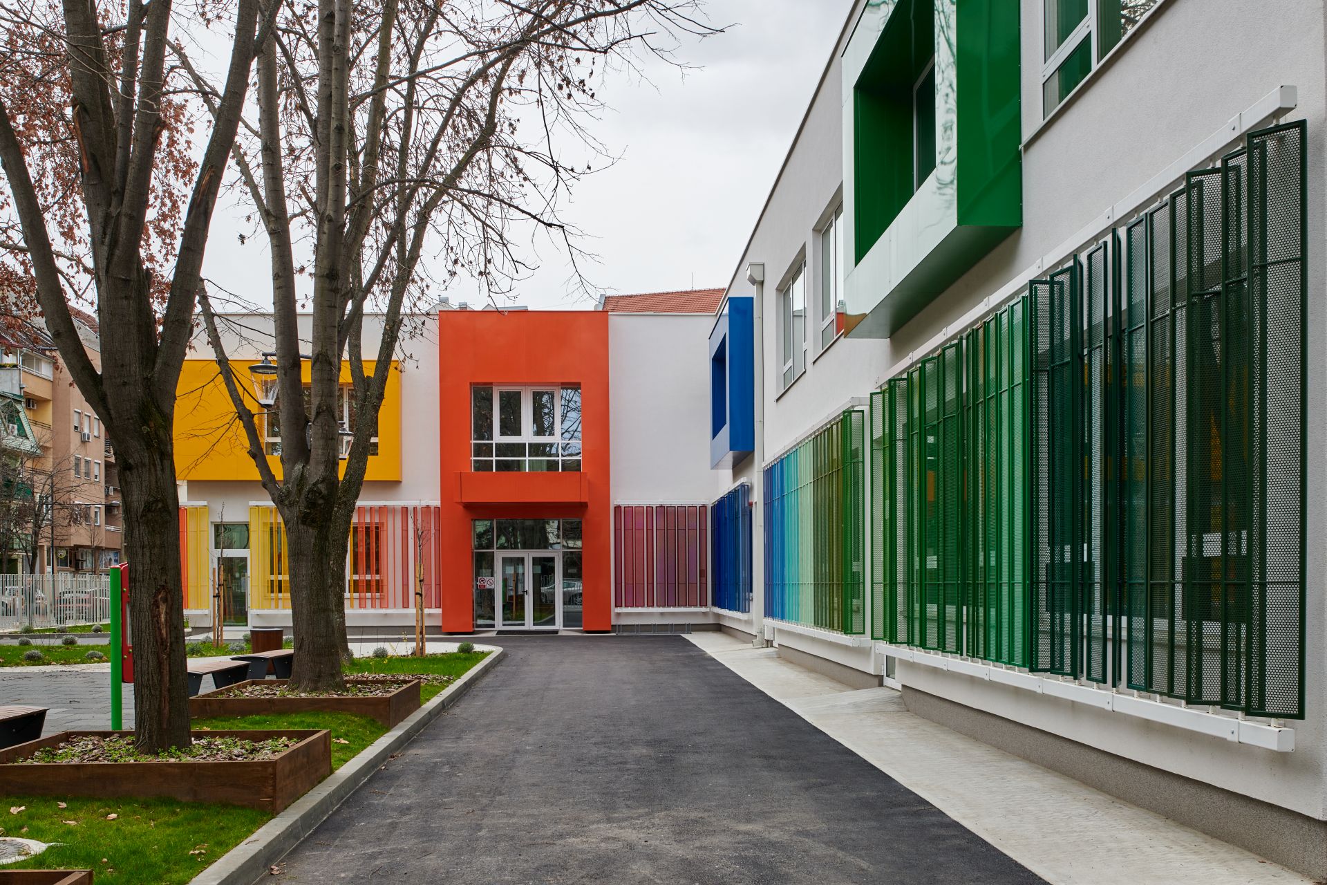 Objekat je razigran naglašenim koloritnim kubusima kao i mrežastim šalukatrama u gradijentu duginih boja.