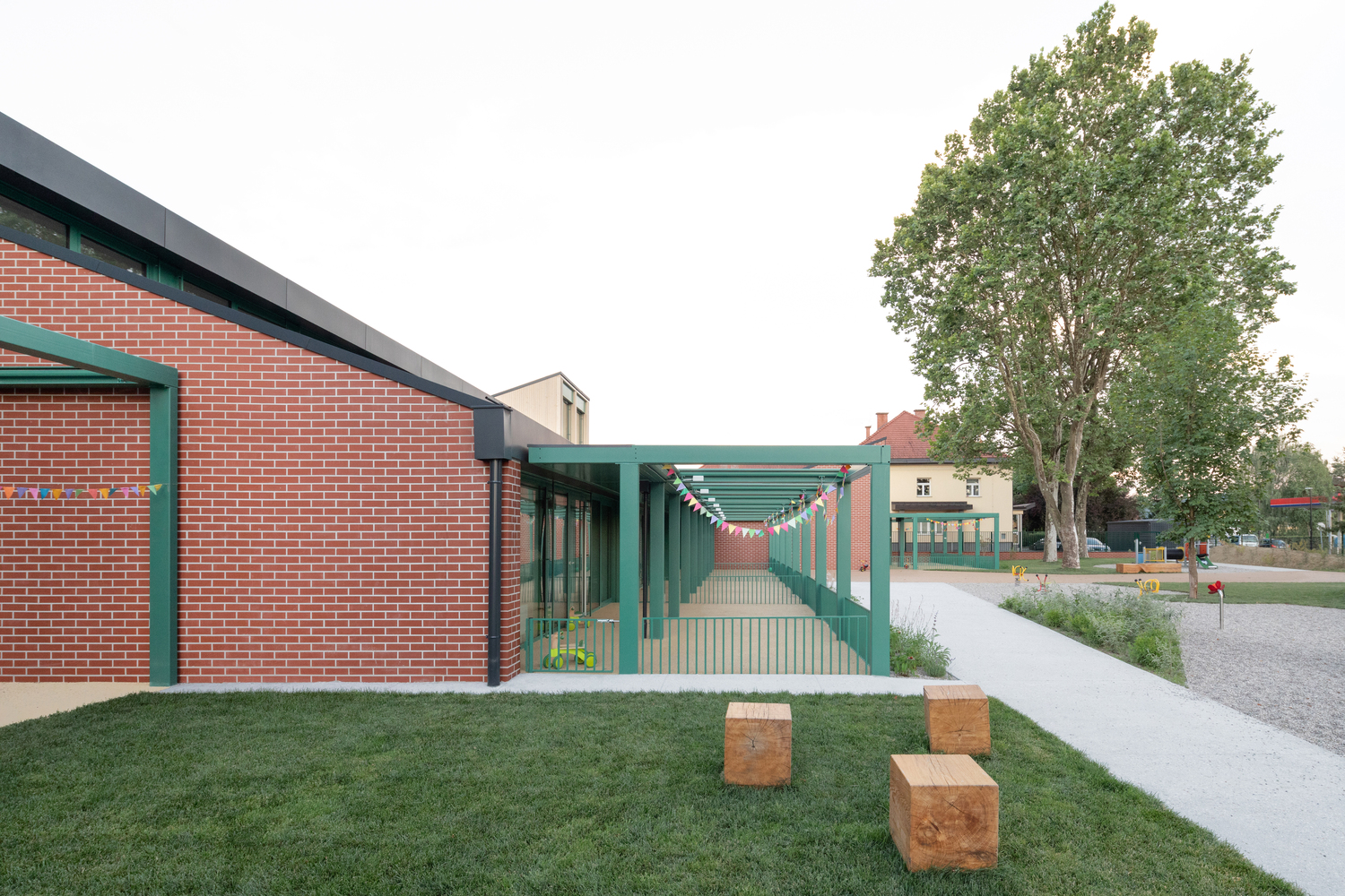 Svojom dinamičnom arhitektonskom kompozicijom, fasadom od opeke, svetlim drvenim volumenima i zelenim ramovima prozora, ovaj vrtić od 2.000 kvadrata nije ostao samo na pukom oličenju postmodernizma osamdesetih, već se razvio na organski način kroz vreme.