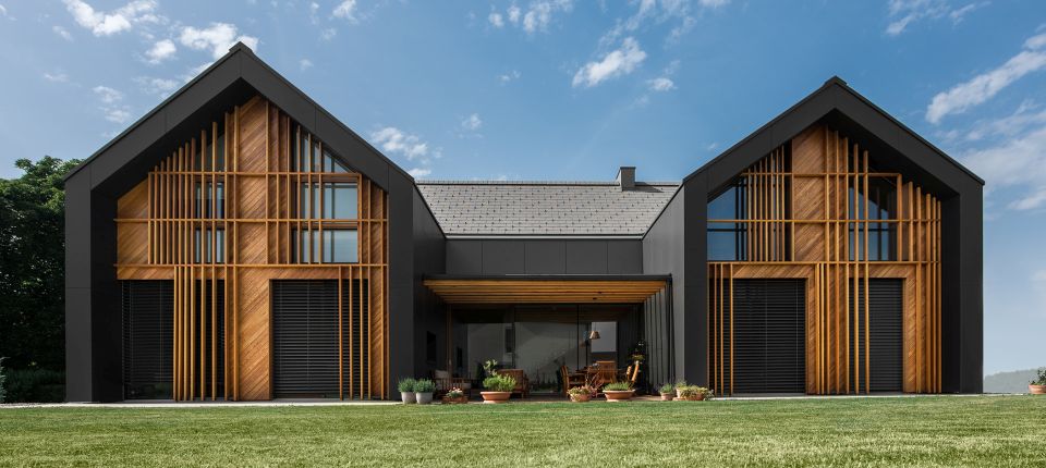 Na parceli od bezmalo 2.000 kvadrata podignuta je kuća 410m2 za sedmočlanu porodicu. Biro SoNo Arhitekti sa timom Edvard Blažko, Marko Volk i Nina Tešanović, isprojektovali su kuću sa dve paralelne lamele koje su povezane trećom lamelom postavljenom upravno na nju. Sve tri lamele završavaju se kosim krovom pokrivenim tamnim pokrivačem – iste boje kao što su i fasadni paneli.
