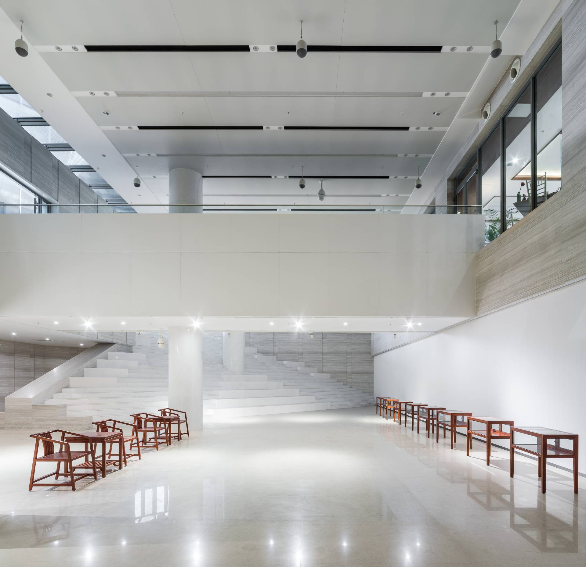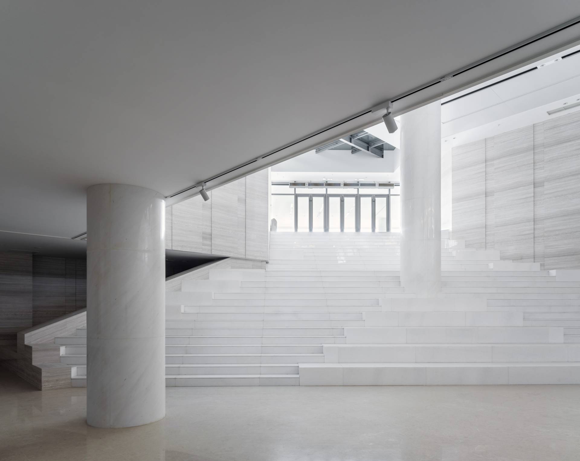 Sadržaji su povezani koridorima, koji su okupani svetlošću sa plafona, kao i skulpturalnim stepeništima u beloj boji.