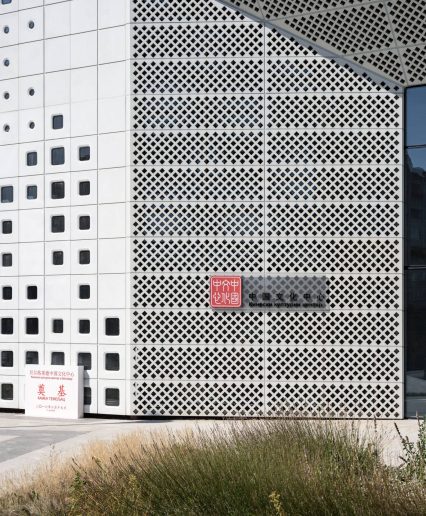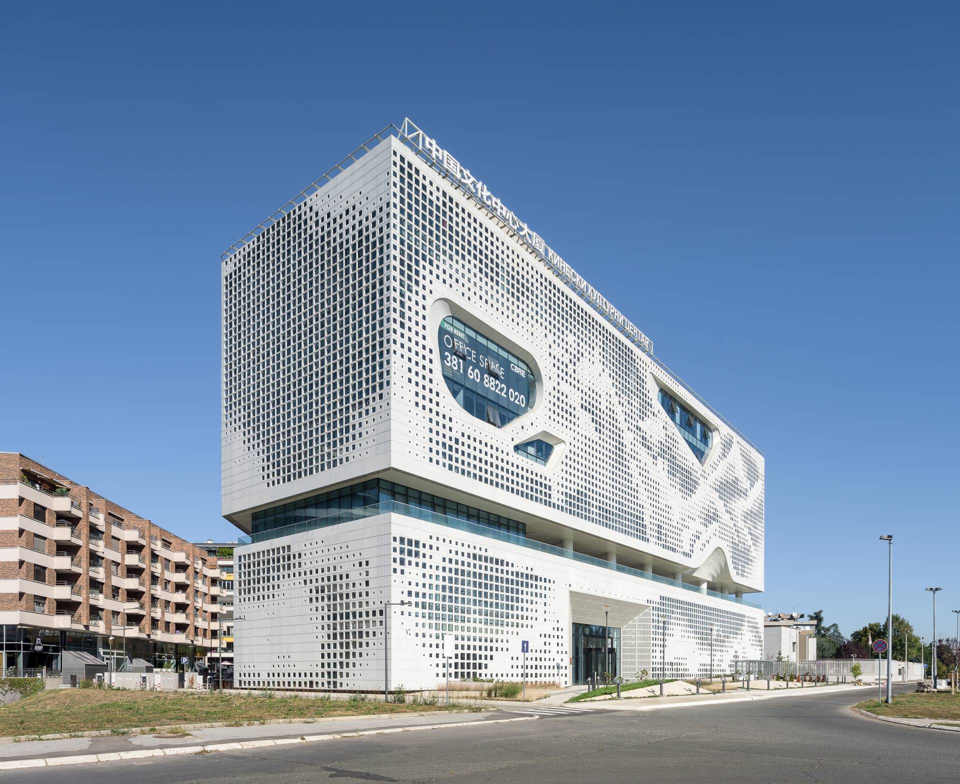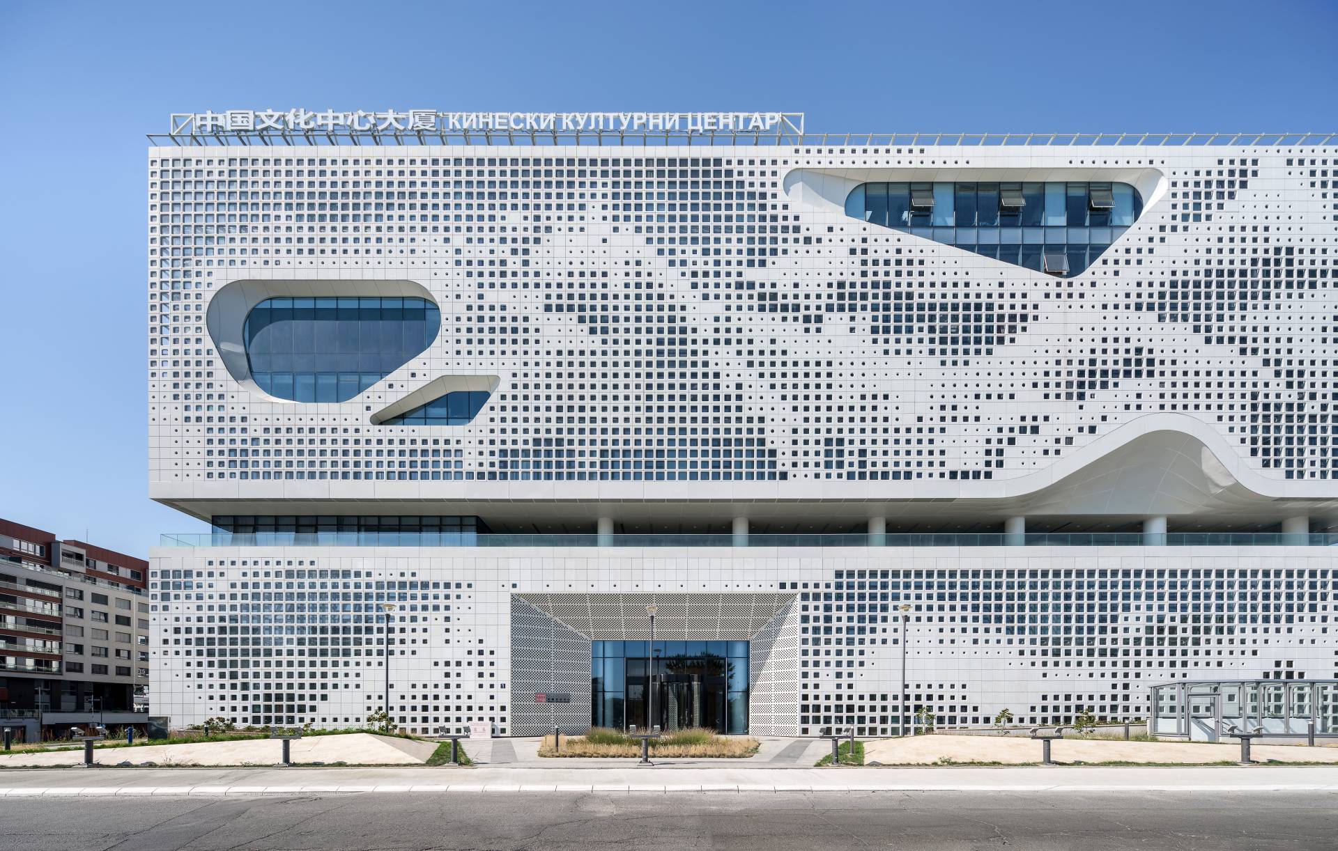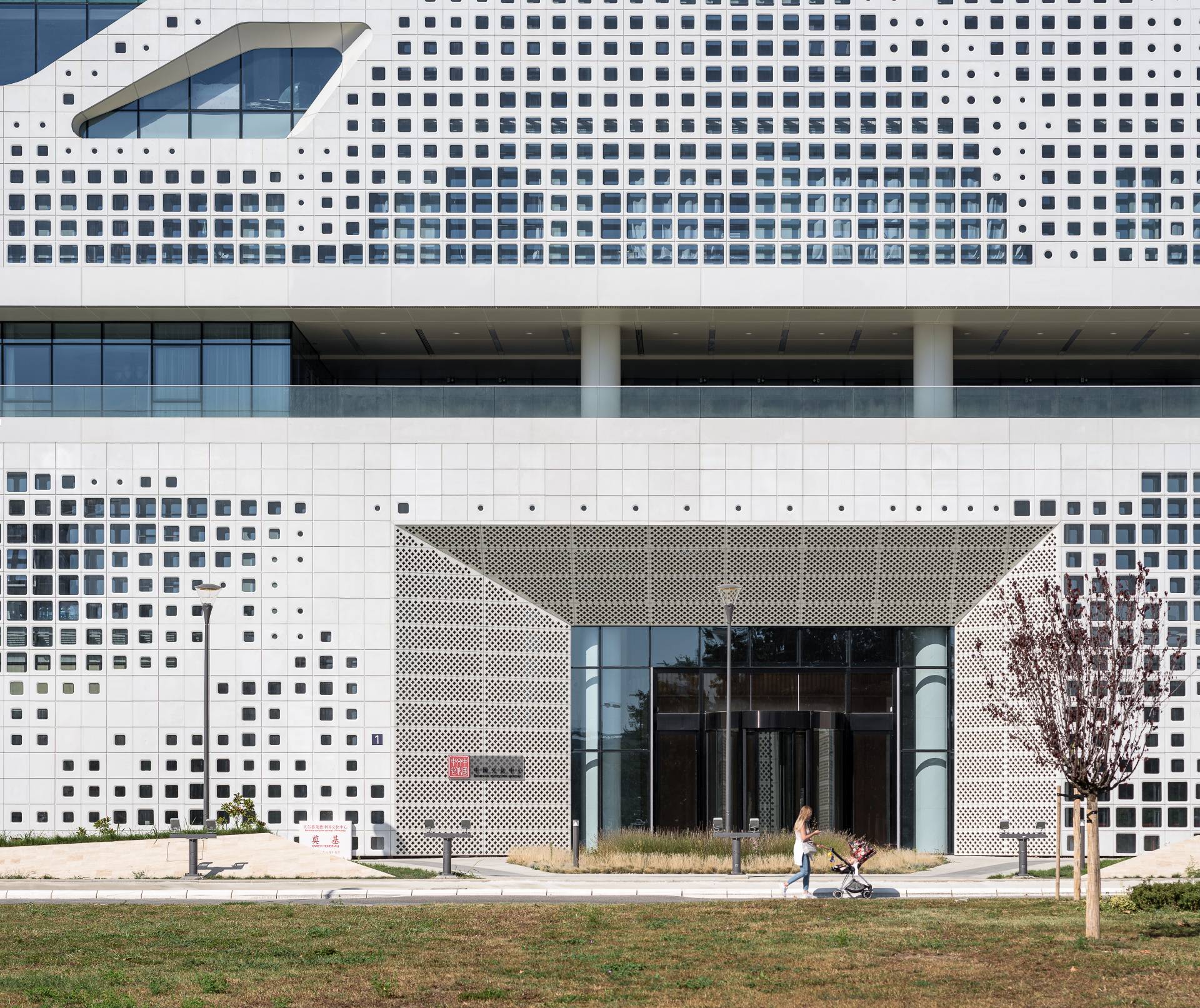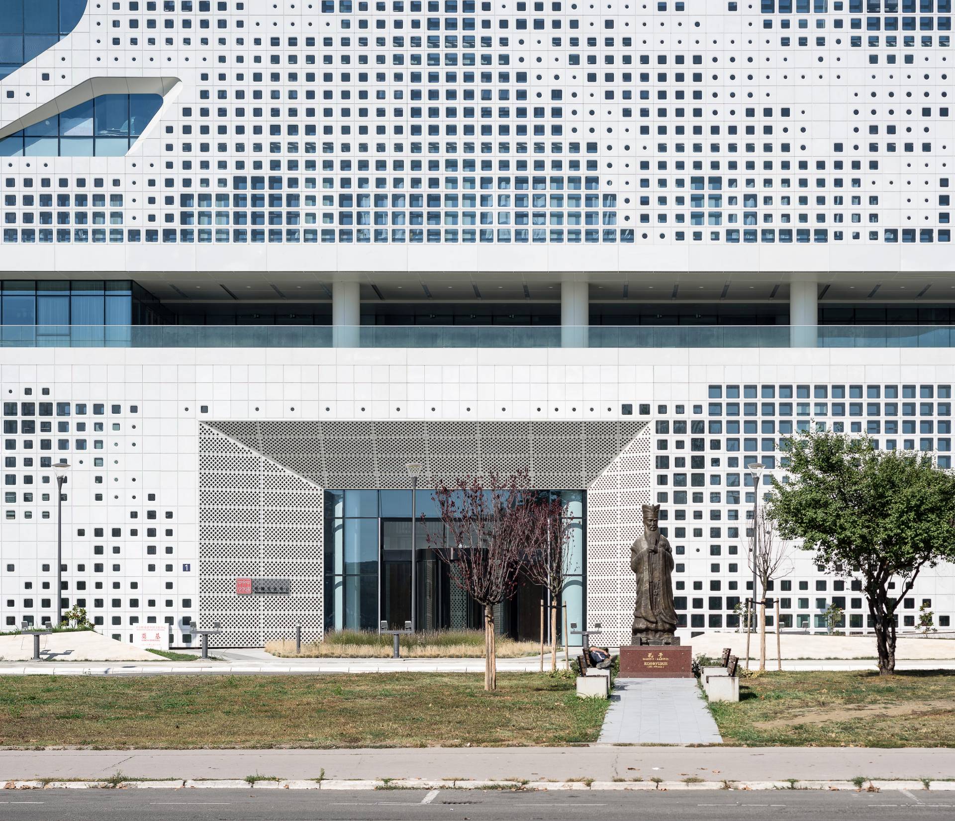 Objekat je dizajniran s naglaskom na modernu arhitekturu sa elementima tradicionalne kineske estetike, što je posebno vidljivo na ventilisanoj fasadi sa amorfnim i kružnim otvorima. Prefabrikovani elementi fasade, proizvedeni od lakog betona od strane turskog Fibrobetona, montirani su prema šemi koja evocira tradicionalni kineski pejzaž, pružajući zgradi jedinstven i prepoznatljiv izgled.