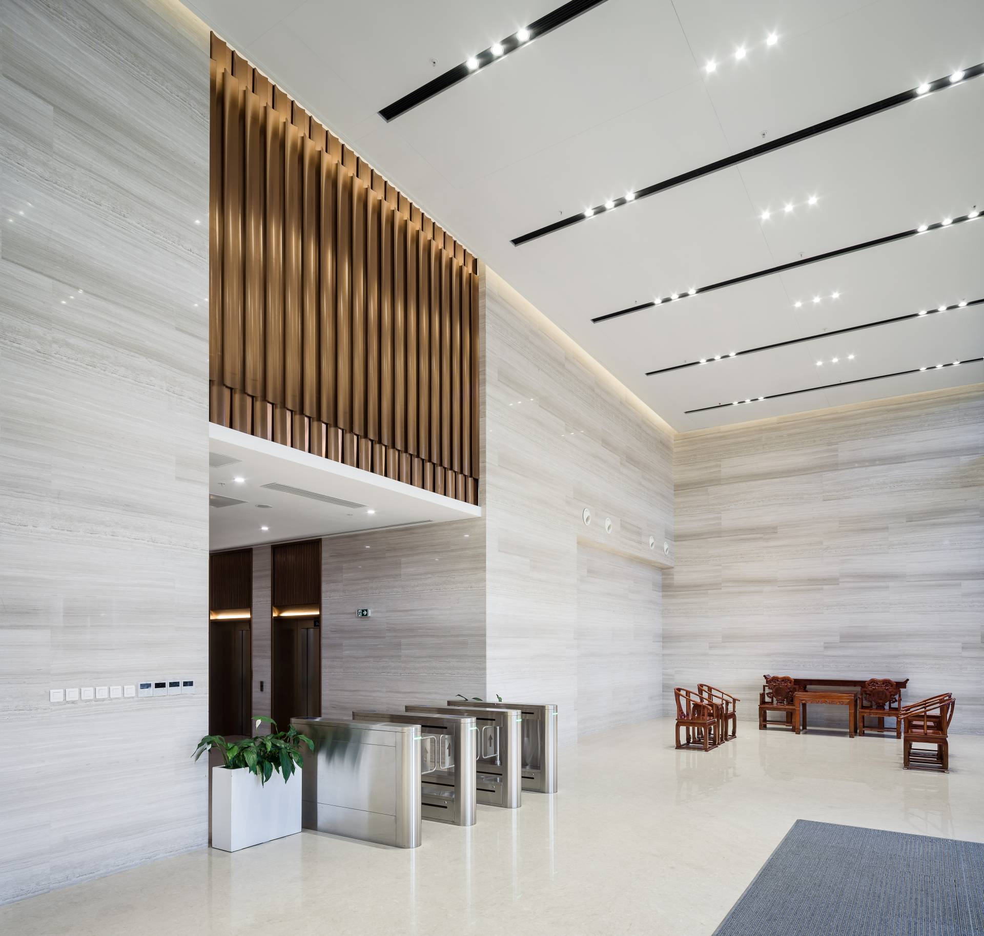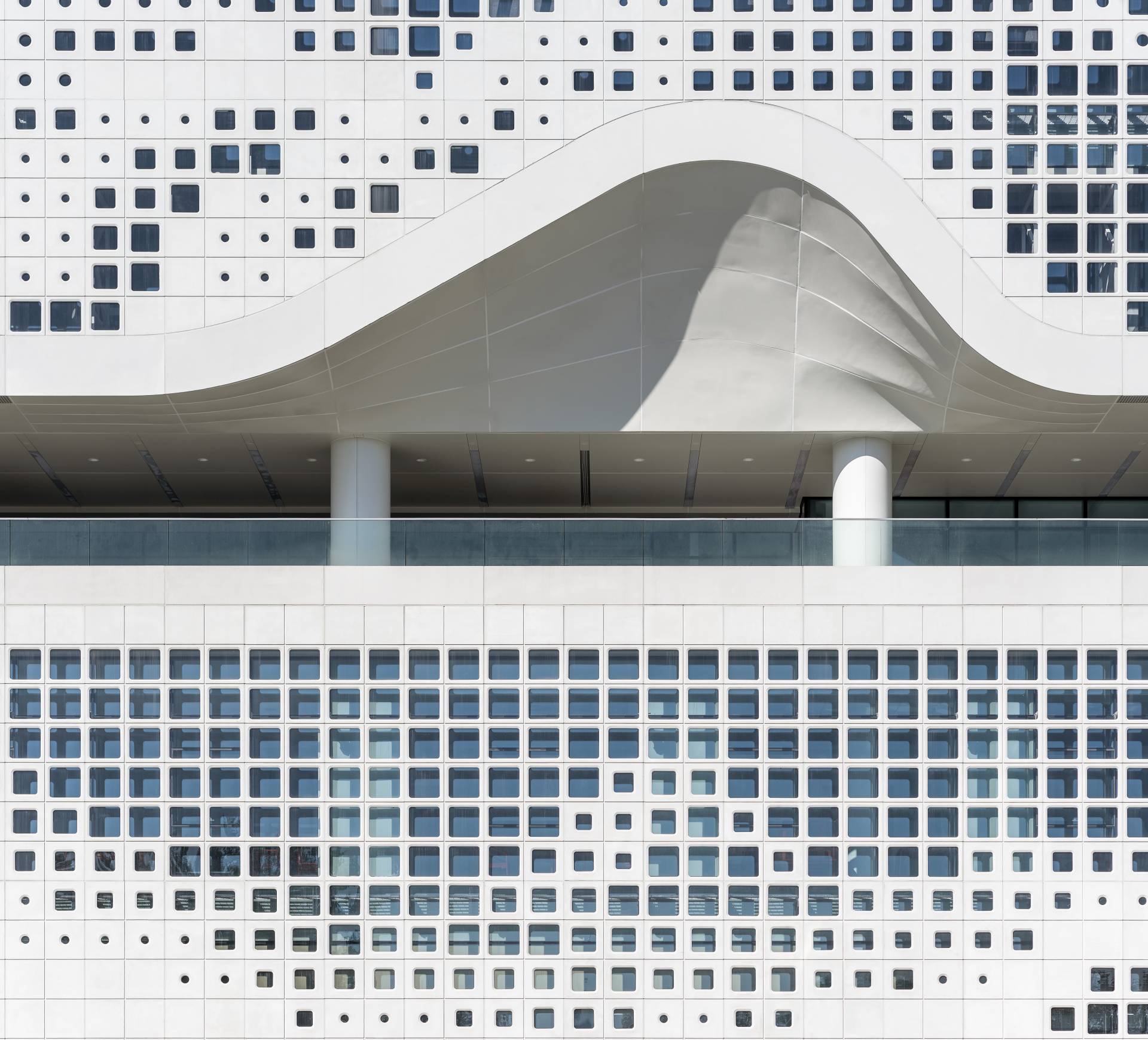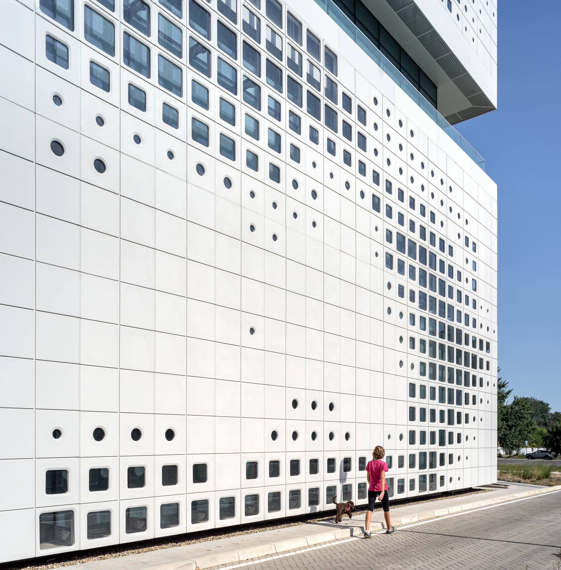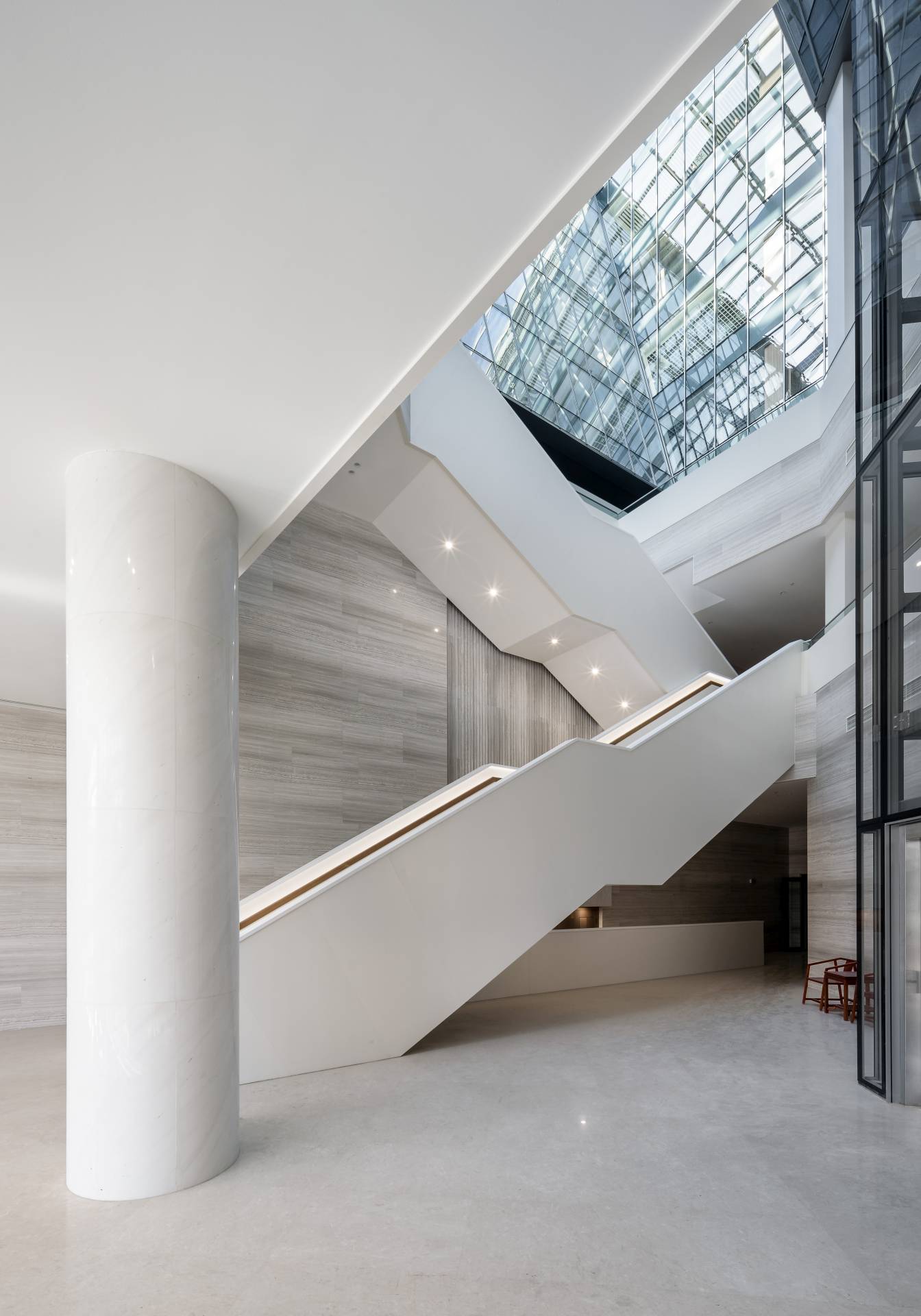 Sadržaji su povezani koridorima, koji su okupani svetlošću sa plafona, kao i skulpturalnim stepeništima u beloj boji.