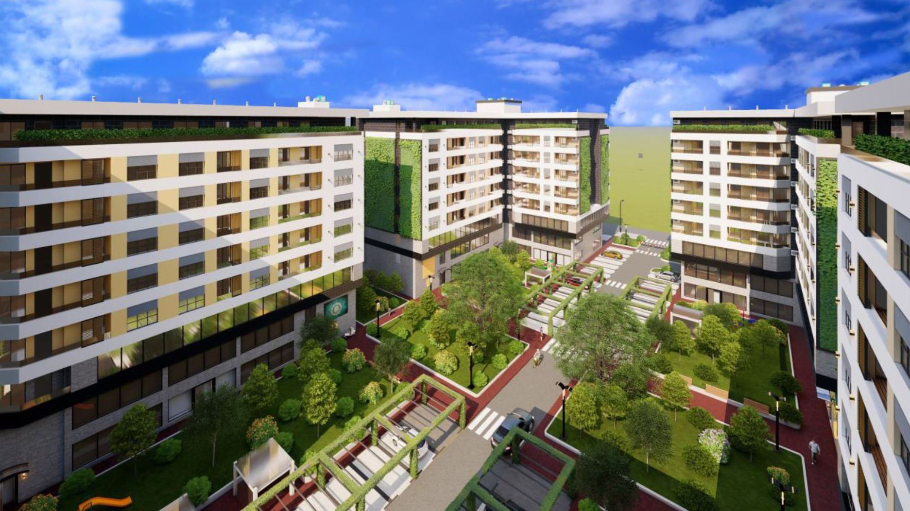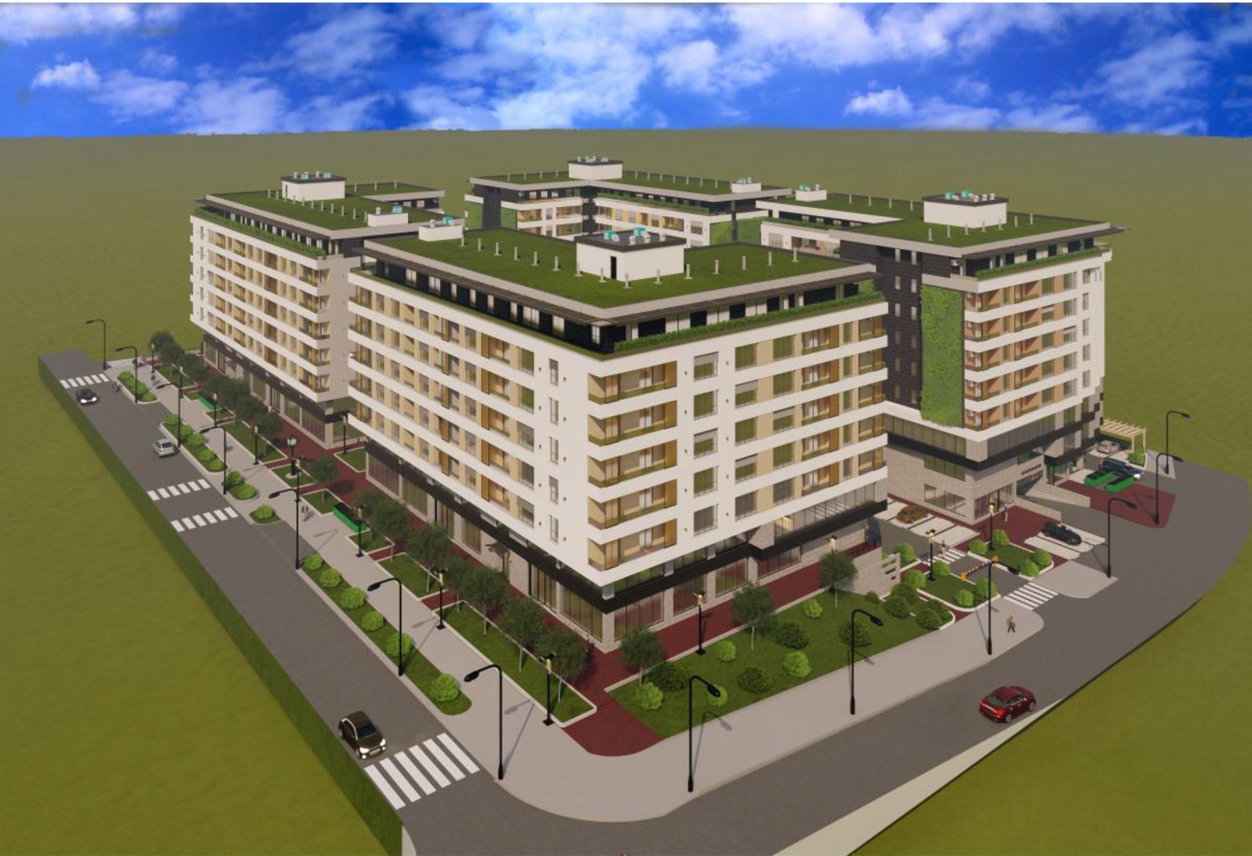 Projektom je takođe planirano ozelenjavanje krova iznad podrumske etaže u zoni unutrašnjeg prostora između objekata A, B, C i D. Planirane su 4 kompaktne zelene površine, međusobno podeljene unutrašnjom kolskom saobraćajnicom i poprečnom pešačkom stazom.