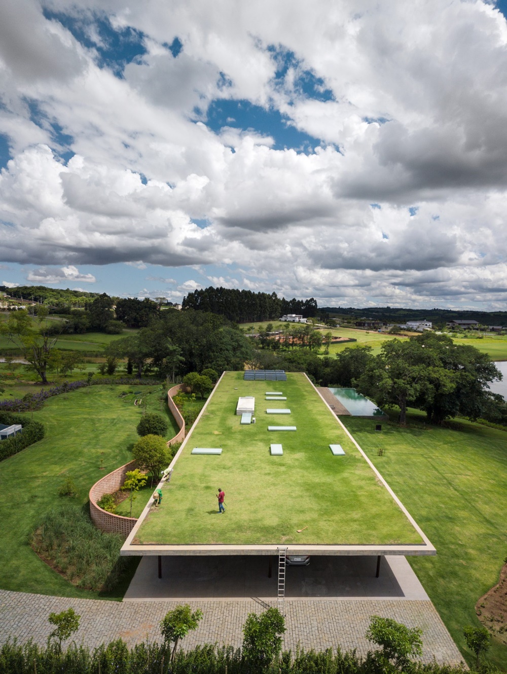 Najimpozantniji deo ove dobro ušuškane minimalističke kuće predstavlja njen ravan krov koji na sebi nosi dodatan teret – pravi zeleni travnjak. Krov se u nekim delovima naslanja na stubove, dok u drugim leže na zidove.