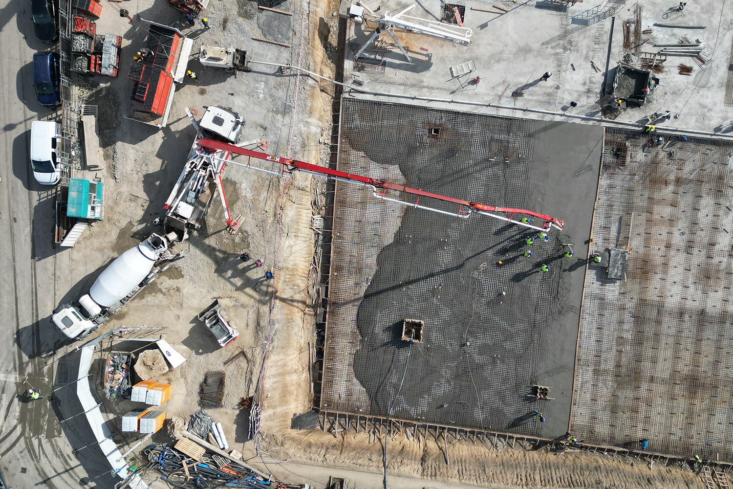 Kao što možete videti na priloženom snimku, trenutno se privodi kraju izrada temeljne ploče objekta, površine od 5.000 kvadrata, u koju će biti ugrađeno 3.000 kubika betona i preko 170 tona armature.