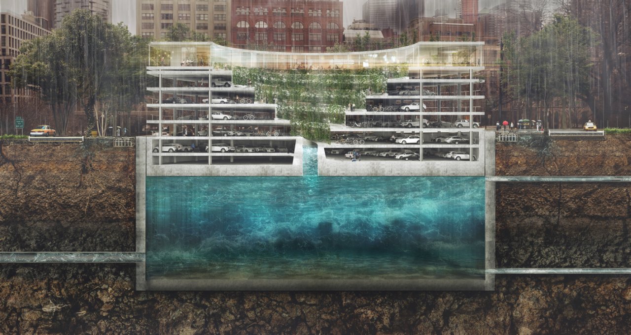 Danska arhitektonska firma Tredje Natur predstavila je Pop-Up, tri-u-jedan zgradu koja rešava problem poplava kao i nedostatka parkinga i zelenih površina u gradovima. Ova struktura, na kojoj su jedno preko drugog naslagani zelena površina, garaža i rezervoar za vodu, koristi Arhimedov zakon kako bi uskladištila vodu i kreirala plutajući prostor za smeštanje automobila, piše ArchDaily.