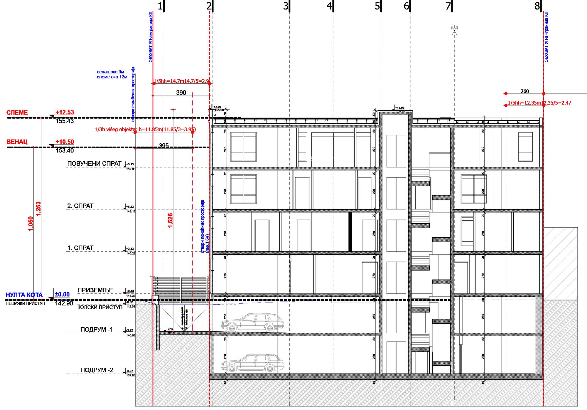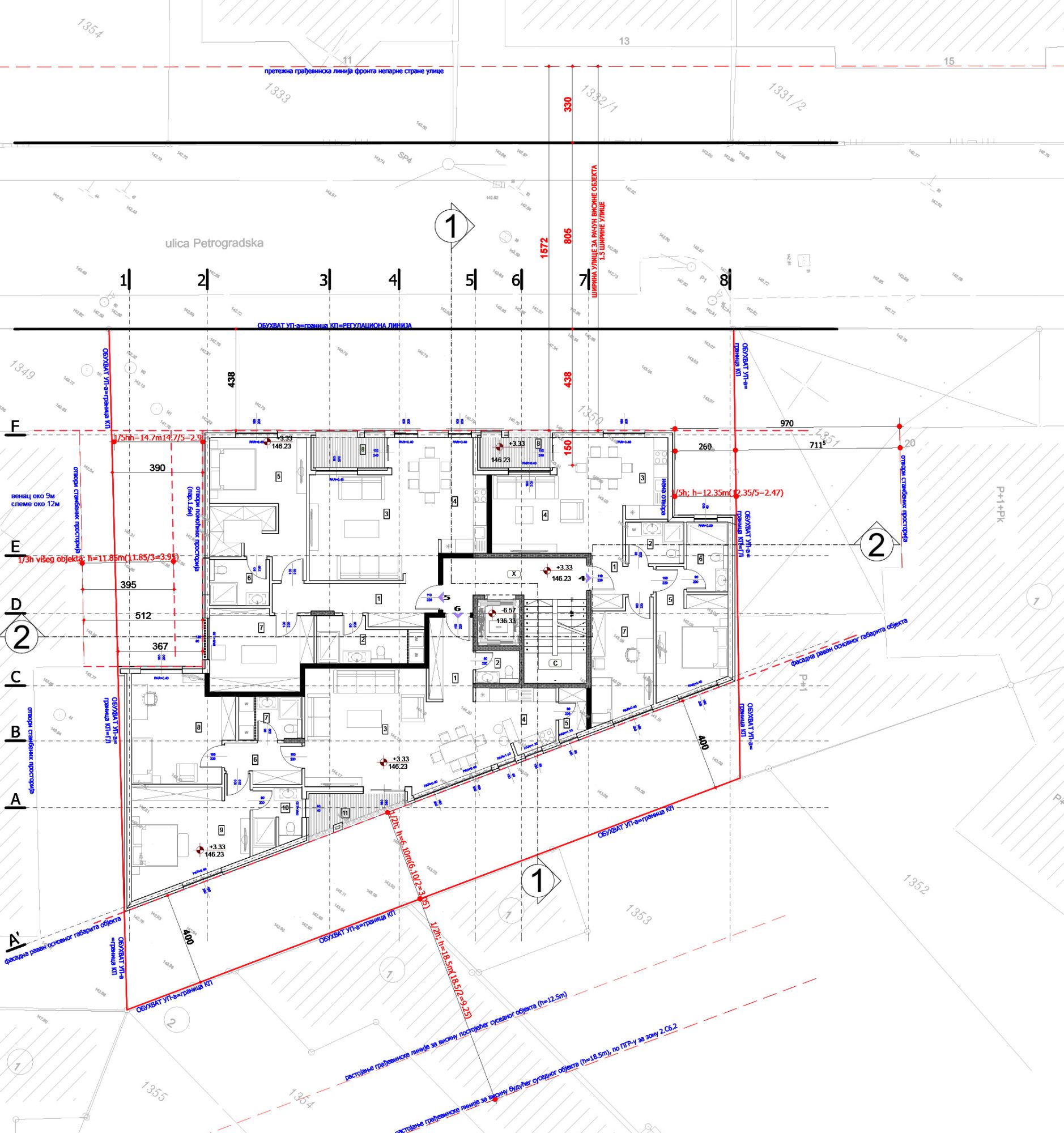 Planirani objekat je stambeni, spratnosti Po(-2)+Po(-1)+P+2+Ps, dvostrano uzidan. Poslednja etaža je projektovana kao treći sprat koji se povlači 1,5 m u odnosu na fasadnu ravan poslednjeg sprata.