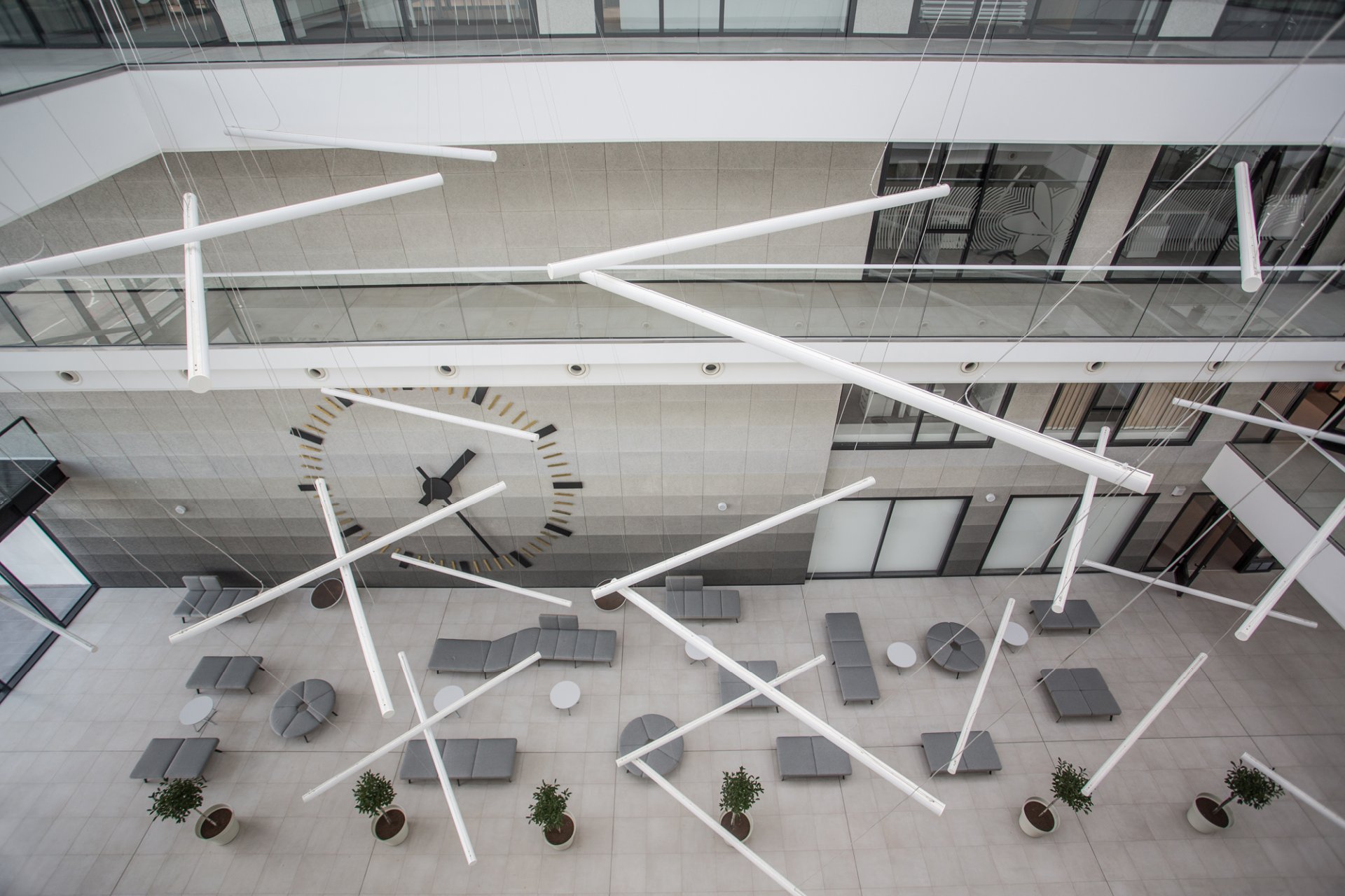 Pored prijemnog pulta, atrijumom dominira veliki INSA zidni sat prečnika šest metara kao i visilice u nepravilnom rasporedu koje dodatno osvetljavaju prostor.
