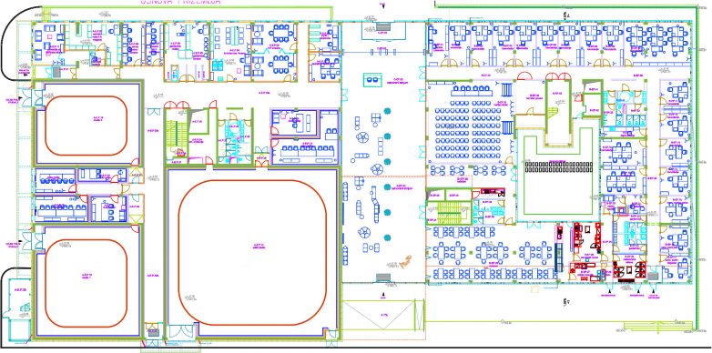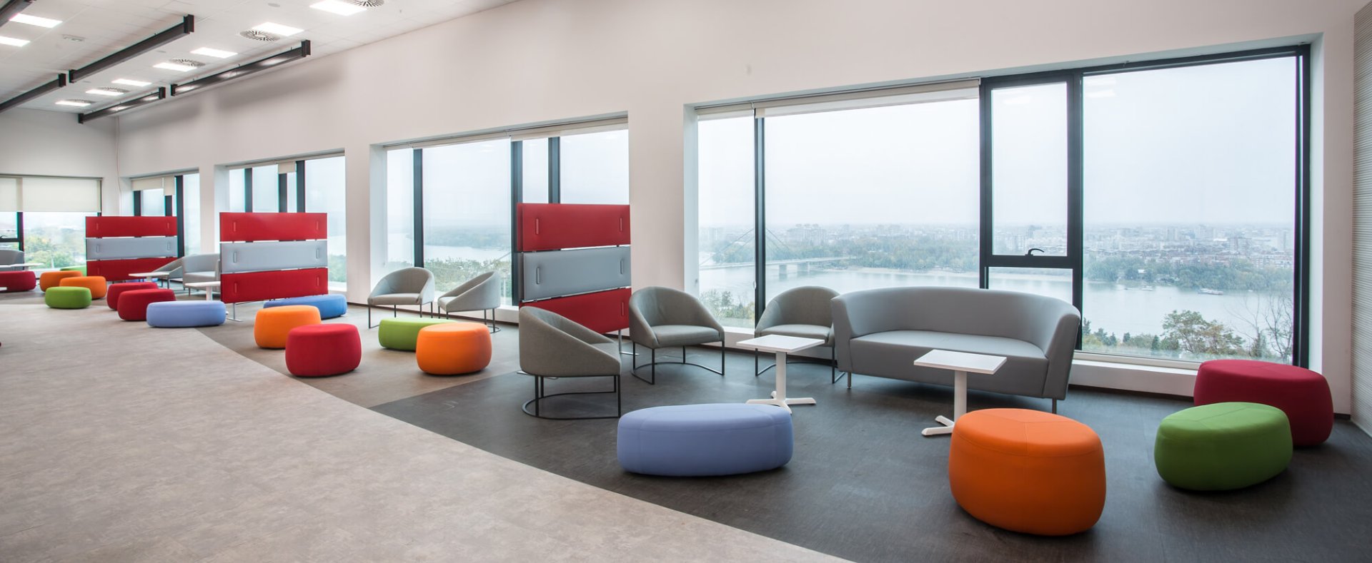U okviru poslovno programskog dela zgrade nalazi se i restoran sa distributivnom kuhinjom i kafeterijom koja je rešena sa tamnom drvenom oblogom i stolicama u različitim bojama koje razigravaju prostor.