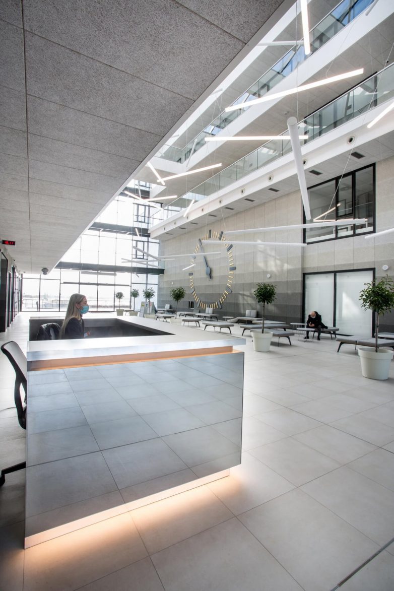 Atrijumom pune visine objekta dominira veliki INSA zidni sat prečnika šest metara.