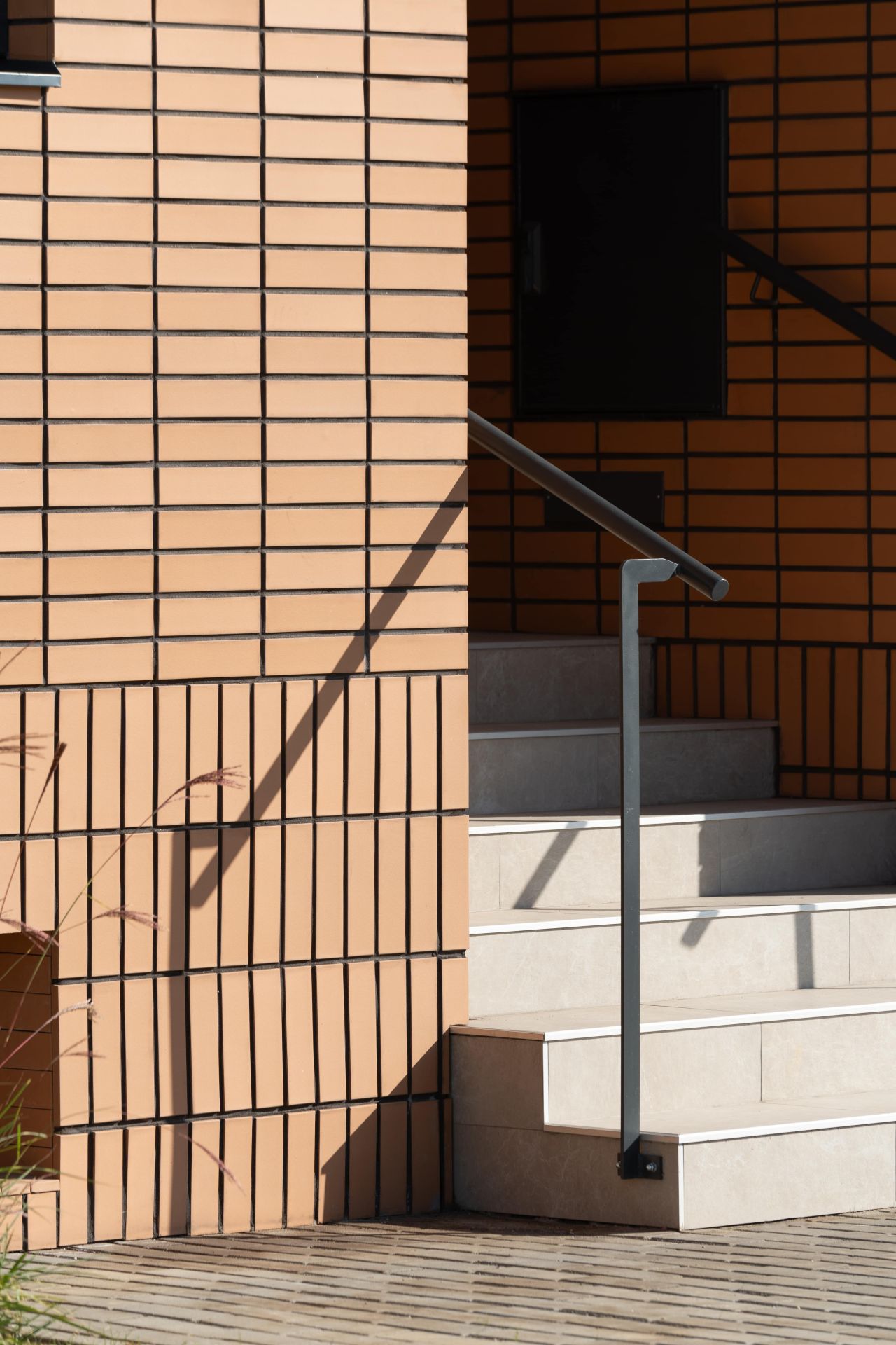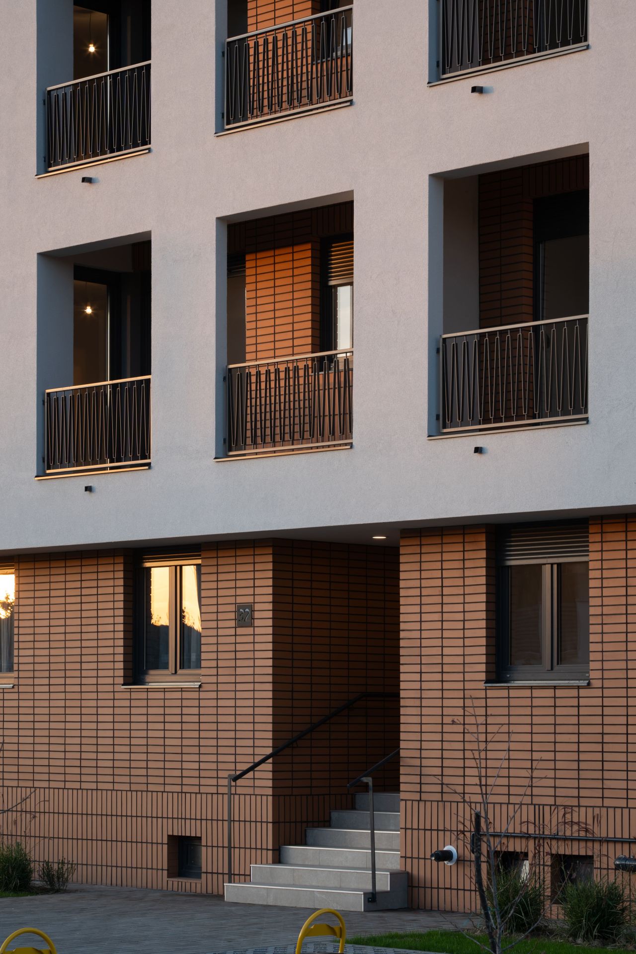 Ograda ulaznog stepeništa sa rukohvatima dobija minimalistički izgled u skladu sa materijalizacijom fasada prizemlja.