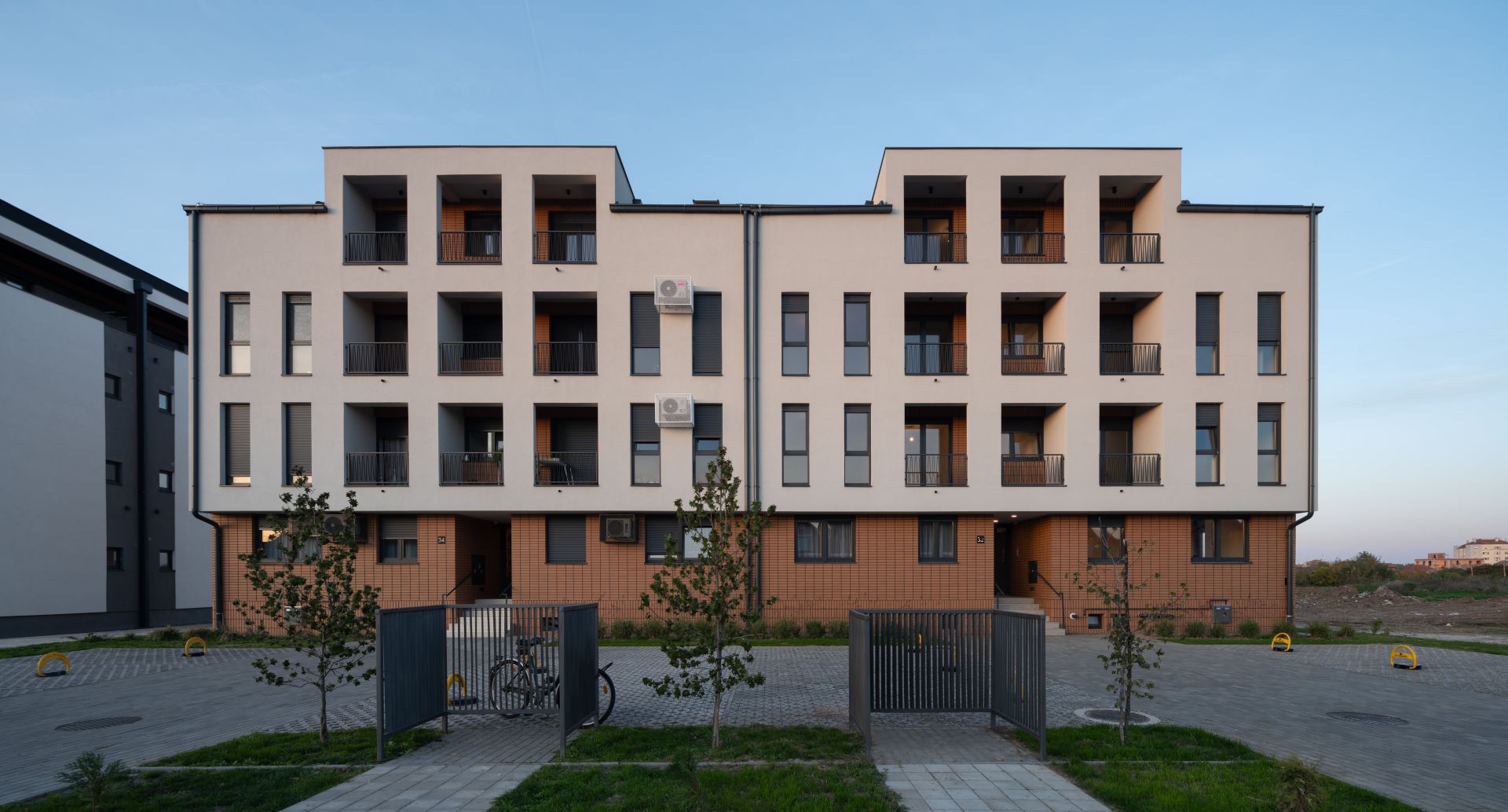 Na dve parcele, istovetnih dimenzija i površina, formirana su dva objekta sa istim brojem rezidencijalnih jedinica, projektovani kao objedinjena arhitektonska celina.