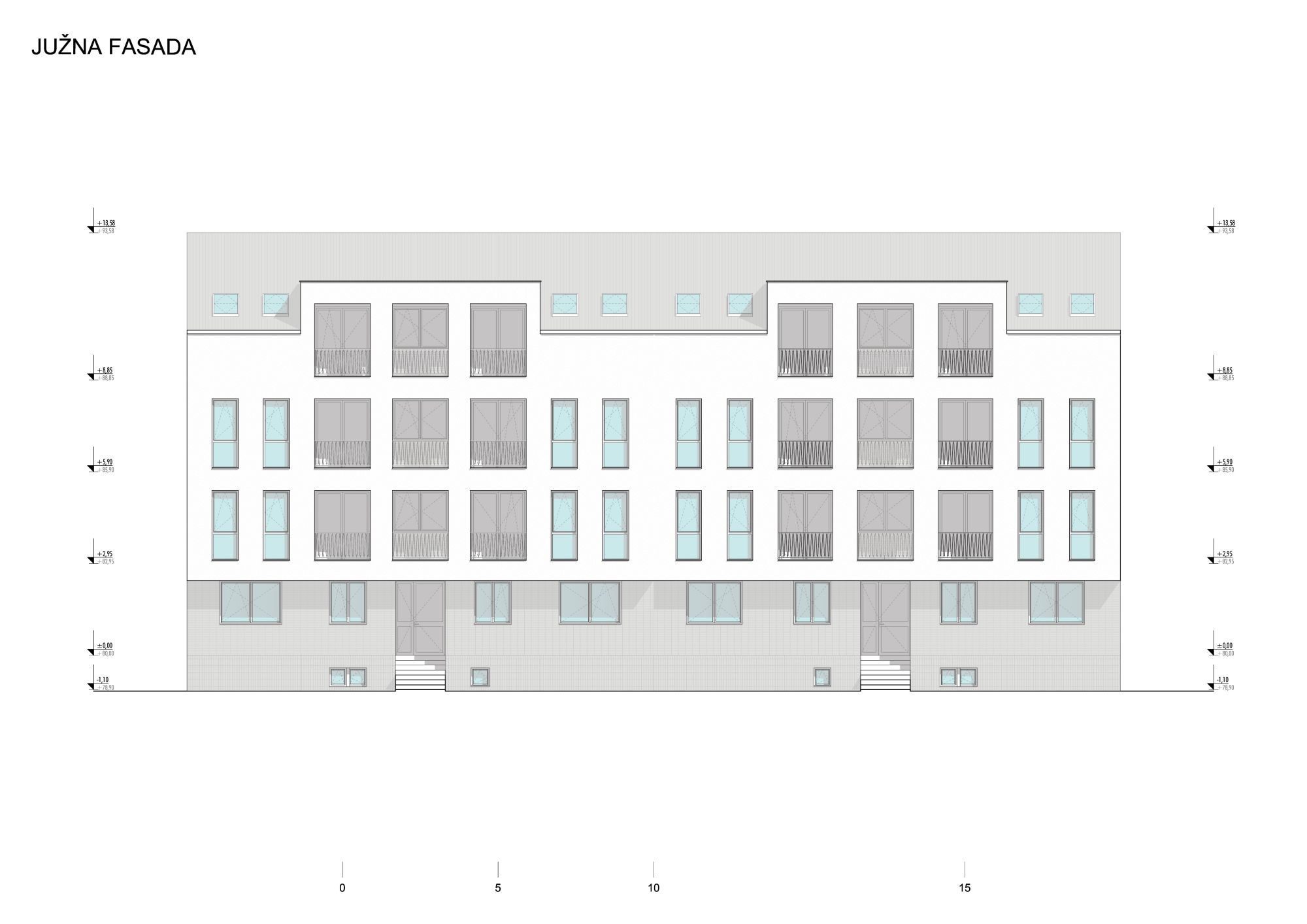 Na prepuštenim etažama spratova u dužini od 0,65 m, odnosno njihovim fasadama, formiran je strogi proporcijski odnos balkonskih otvora i prozora.