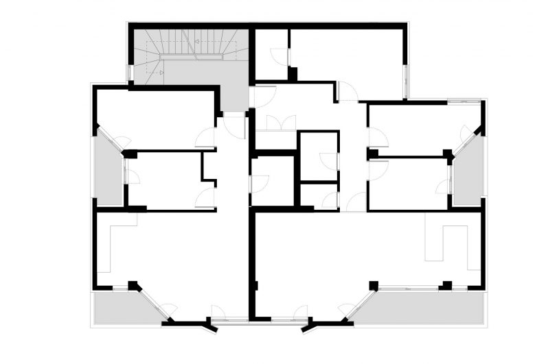 Arhitektonski plan obuhvata šest stambenih jedinica raspoređenih na tri nivoa i jedan podzemni nivo koji služi za parking sa glavnim pristupom zgradi sa istočne strane.