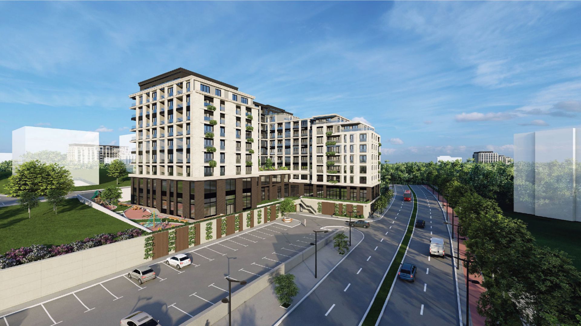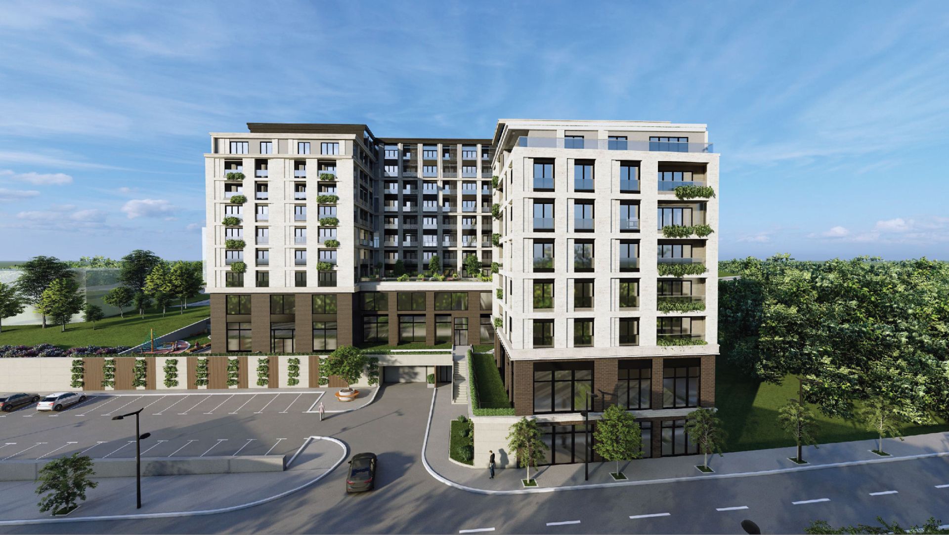 Parkiranje je rešeno u okviru četiri podzemne etaže sa ukupno 226 parking mesta. Objekat je projektovan tako da je kolski pristup, ulaz u garažu, ostvaren iz novoprojektovane ulice Nova 1.