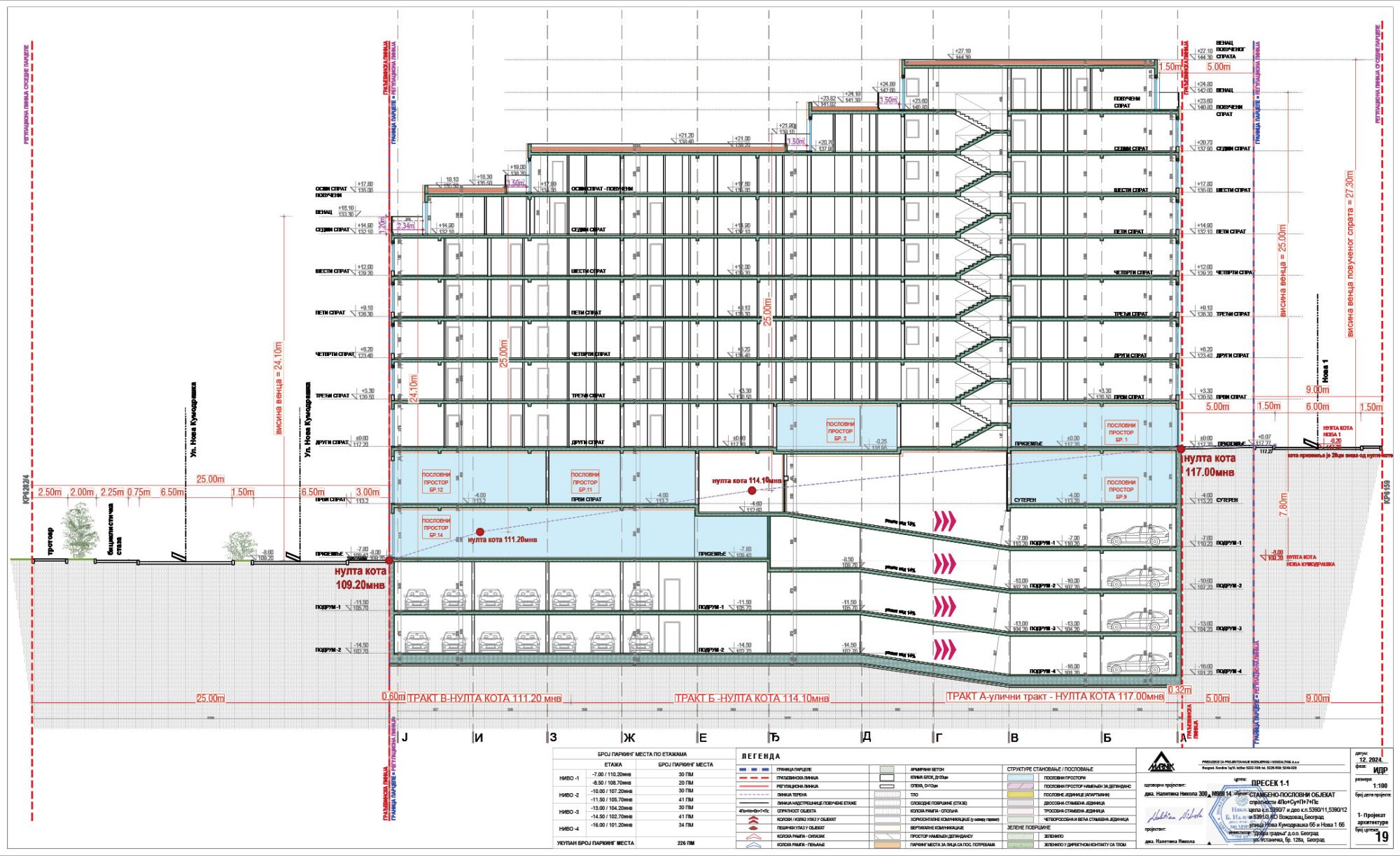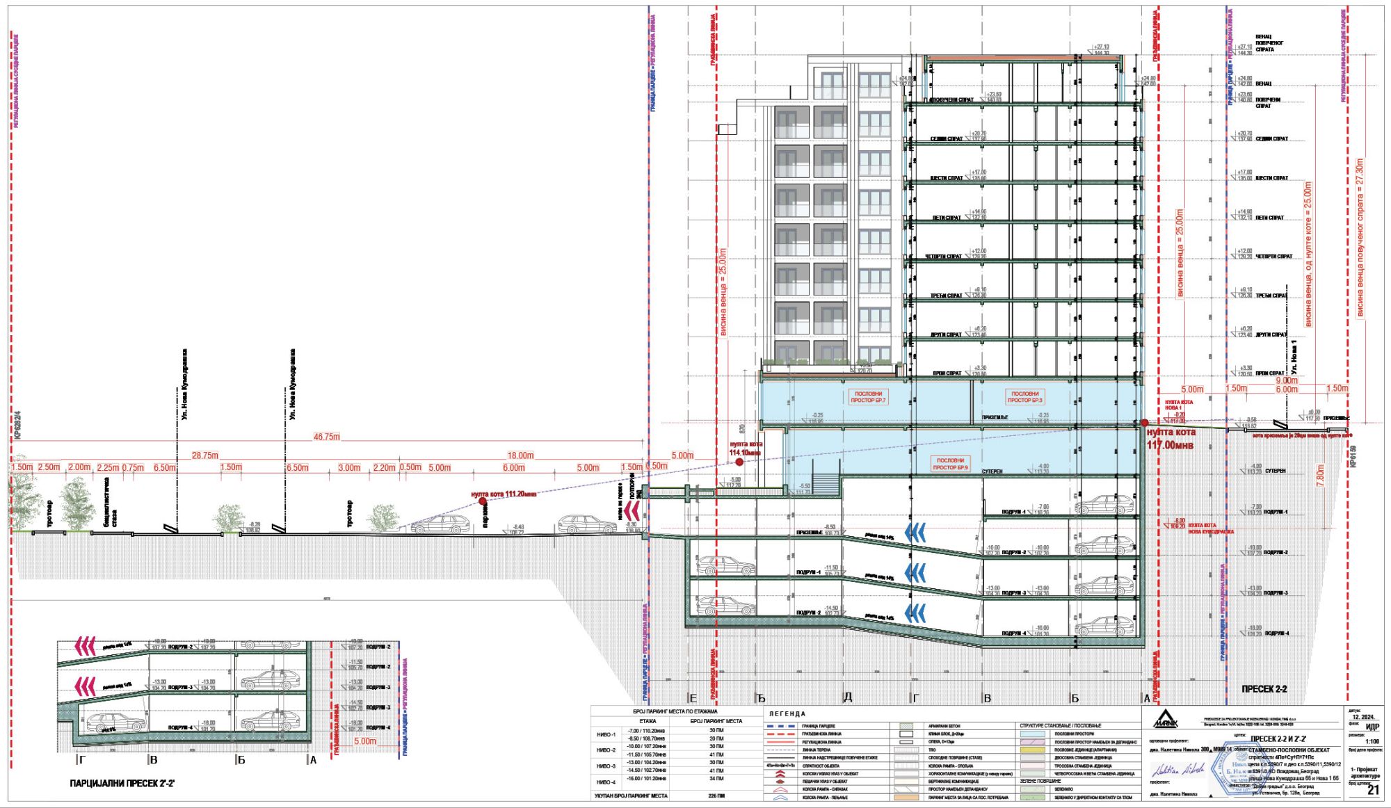 Parkiranje u objektu je rešeno u okviru četiri podzemne etaže sa ukupno 226 parking mesta.