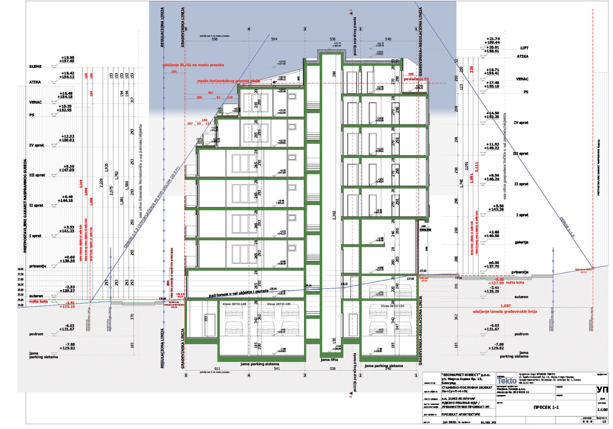 Što se tiče predmetne zgrade, iz idejnog rešenja može se videti da je planirana izgradnja objekta spratnosti Po+Su+P+4+Ps, koji je funkcionalno podeljen u tri celine: stambenu, poslovnu i garažu.