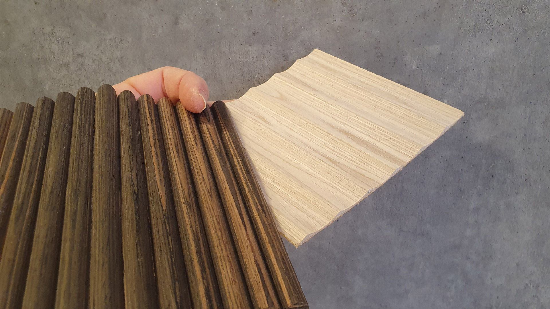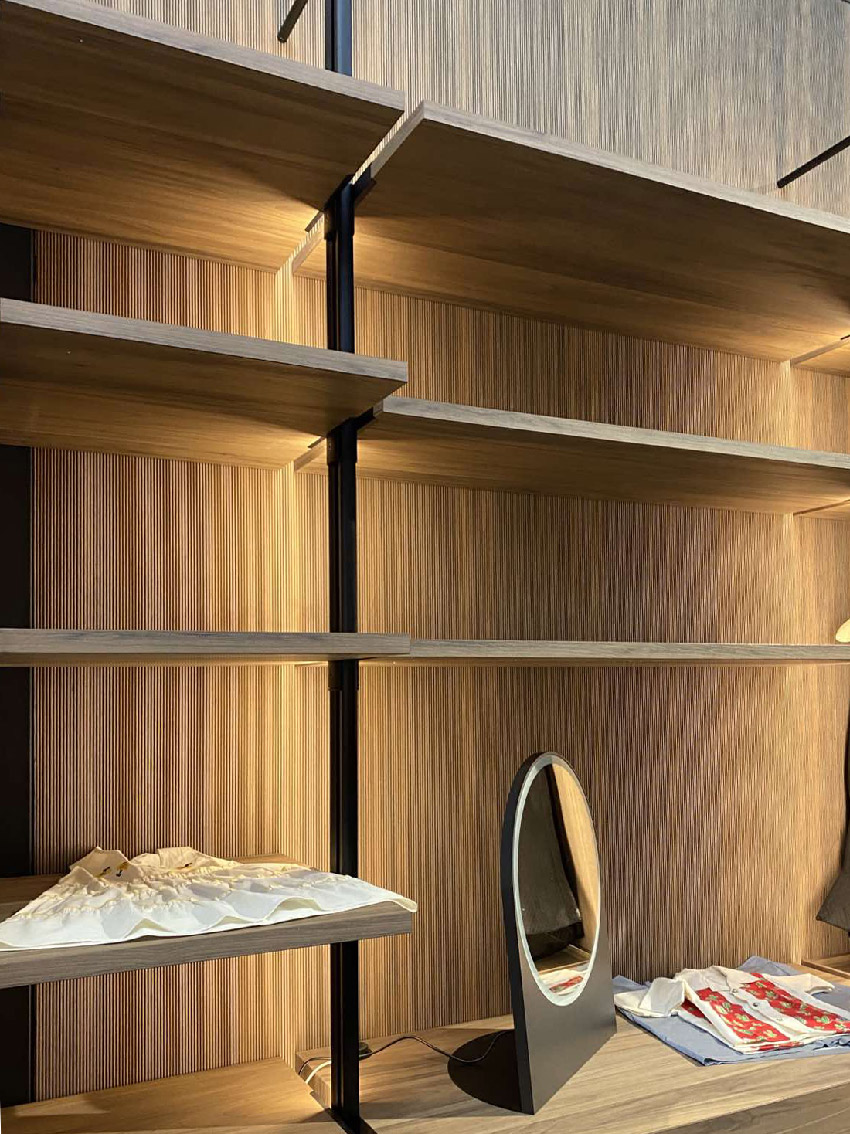 Za ravne površine koriste se fiksne letvice koje su već zalepljene na MDF. Leđa su im takođe obrađena u furniru koji može biti isti kao boja prednje strane sa letvicama ili se može odabrati neka druga nijansa.