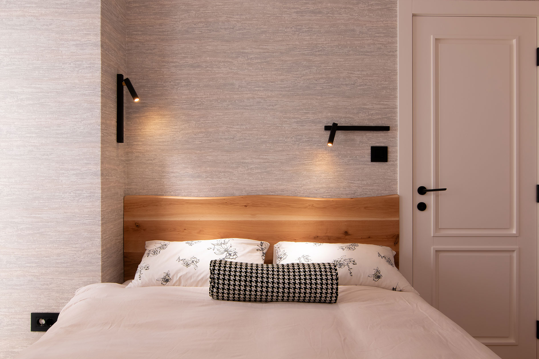 Za master spavaću sobu važno je istaći tapete kao i uzglavlje samog kreveta koje je urađeno od punog drveta sa live edge ivicom koje je spavaćoj sobi dalo dodatni akcenat.