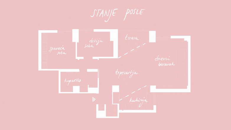 U pitanju je rekonstrukcija stana gde je čitava ideja novoprojektovanog rešenja bila – otvorenost plana. U to ime, kuhinjski zidovi su ukinuti, time je čitav dnevni boravak postao prostrani deo stana u kome se najviše provodi vreme.